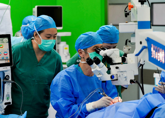 魏文斌帶領(lǐng)的眼科專(zhuān)家團(tuán)隊(duì)手術(shù)及帶教現(xiàn)場(chǎng)(施術(shù)者為史翔宇教授)