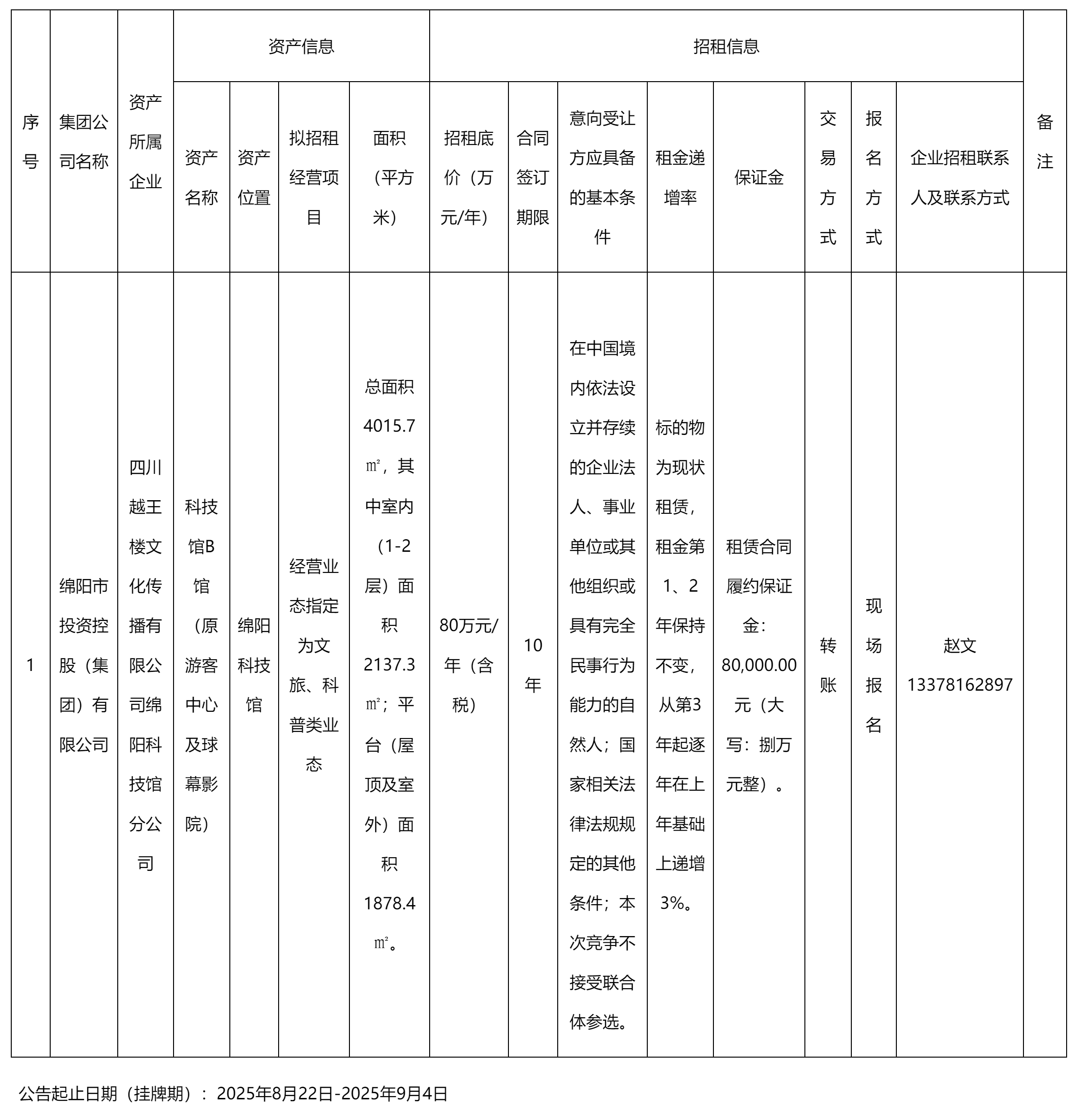 四川越王樓文化傳播有限公司綿陽科技館分公司資產出租公告