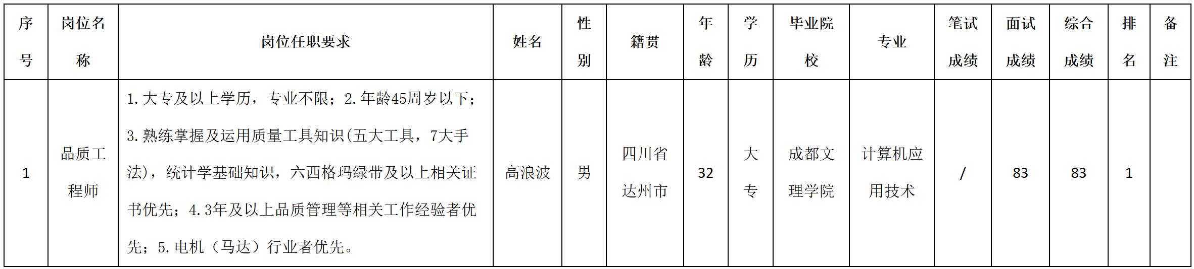 根據四川安和精密電子電器股份有限公司發(fā)布的招聘公告及招聘相關規(guī)定,經筆試、面試等程序,現將筆試(面試)成績予以公示。