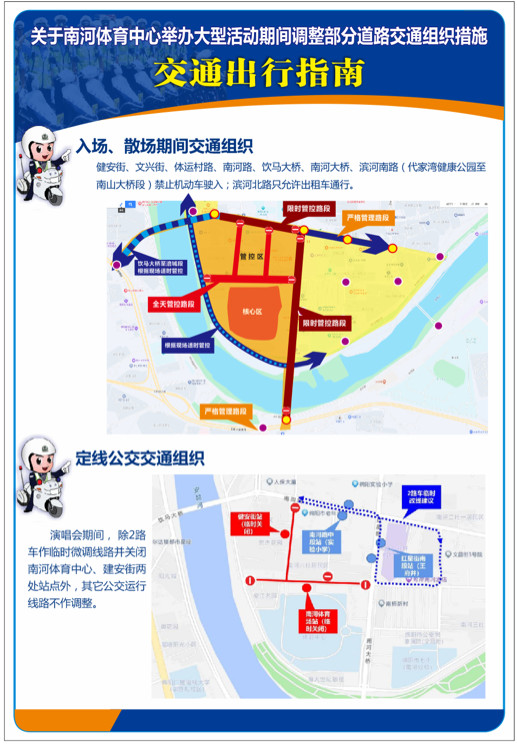 (三)22:00至觀眾離場完畢,健安街、文興街、體運村路、南河路、飲馬大橋、南河大橋、濱河南路(代家灣健康公園至南山大橋段)禁止機動車駛入;濱河北路只允許出租車通行。