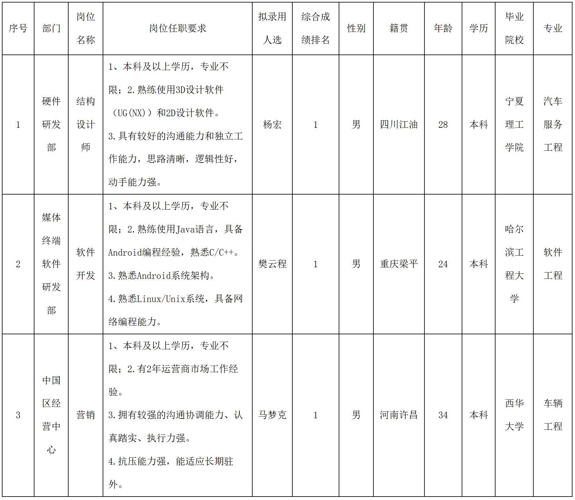 根據(jù)四川長虹新網(wǎng)科技有限責(zé)任公司發(fā)布的招聘公告及招聘相關(guān)規(guī)定,經(jīng)筆試、面試、考察、體檢等程序,擬錄用楊宏等同志到公司工作,現(xiàn)予以公示,具體情況如下:
