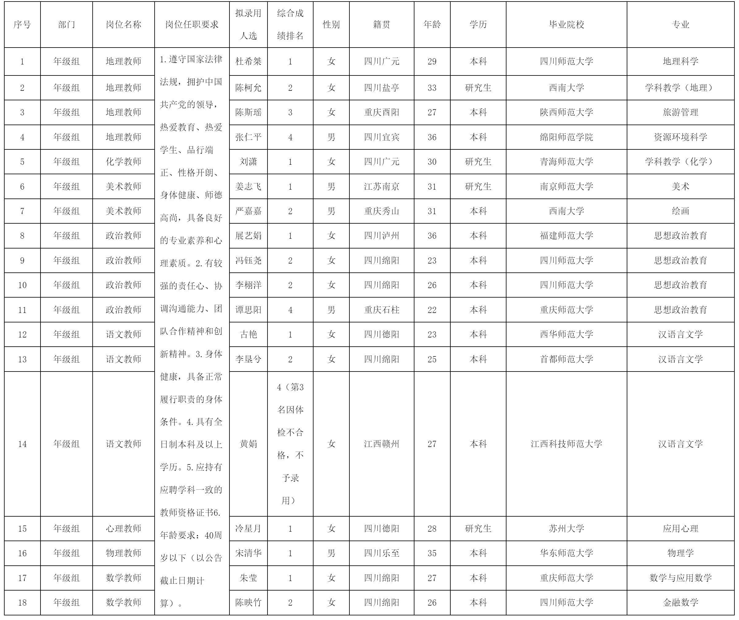 根據(jù)綿陽中學(xué)實(shí)驗(yàn)學(xué)校發(fā)布的招聘公告及招聘相關(guān)規(guī)定,經(jīng)筆試、試講、面試、考察、體檢等程序,擬錄用陳柯允等18名同志到綿陽中學(xué)實(shí)驗(yàn)學(xué)校工作,現(xiàn)予以公示,具體情況如下: