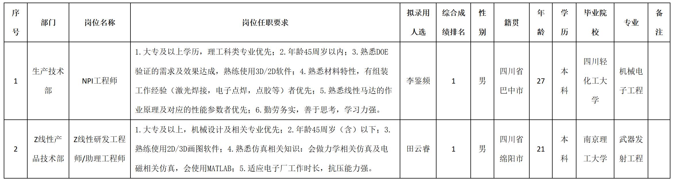 根據(jù)四川安和精密電子電器股份有限公司發(fā)布的招聘公告及招聘相關(guān)規(guī)定,經(jīng)筆試、面試、考察、體檢等程序,擬錄用李鑒頻等2名同志到四川安和精密電子電器股份有限公司工作,現(xiàn)予以公示,具體情況如下: