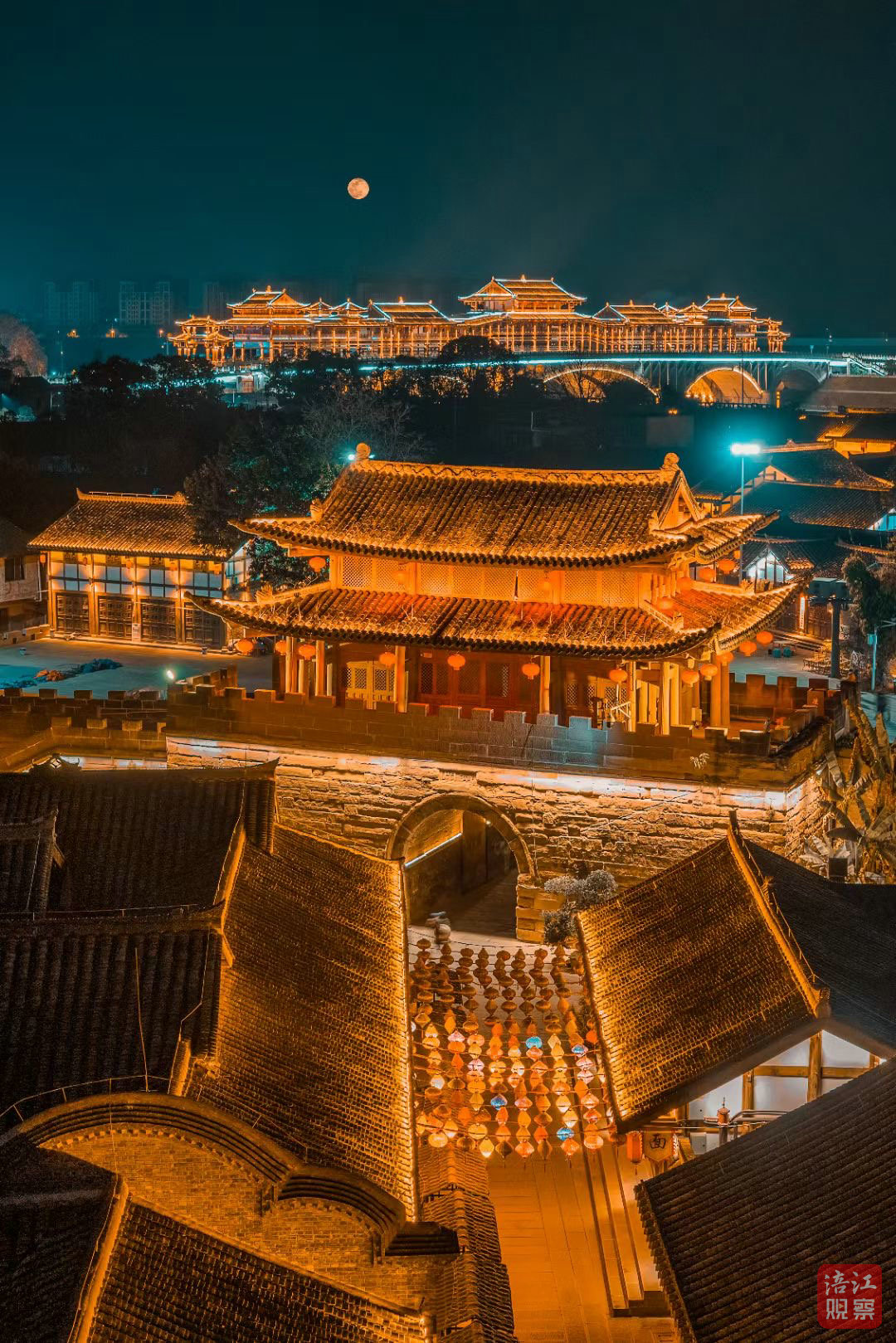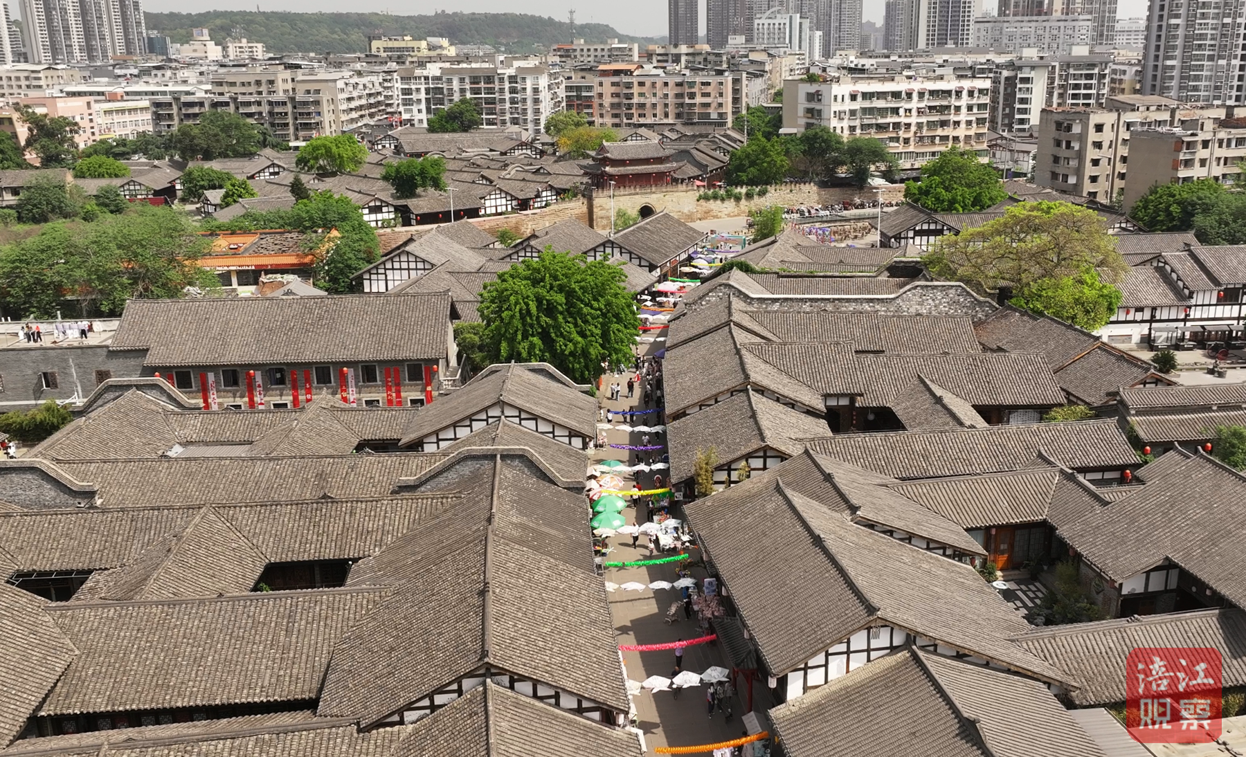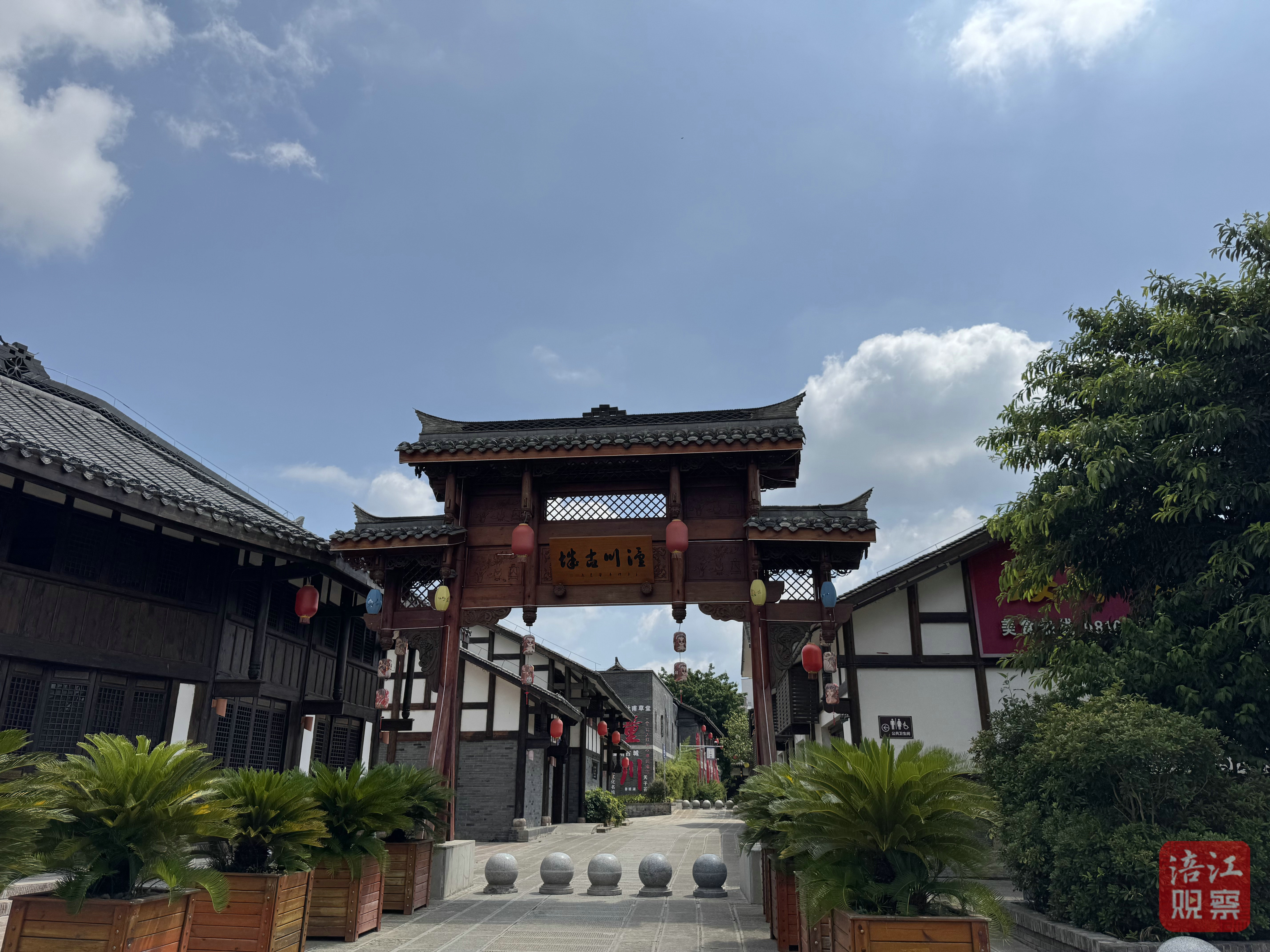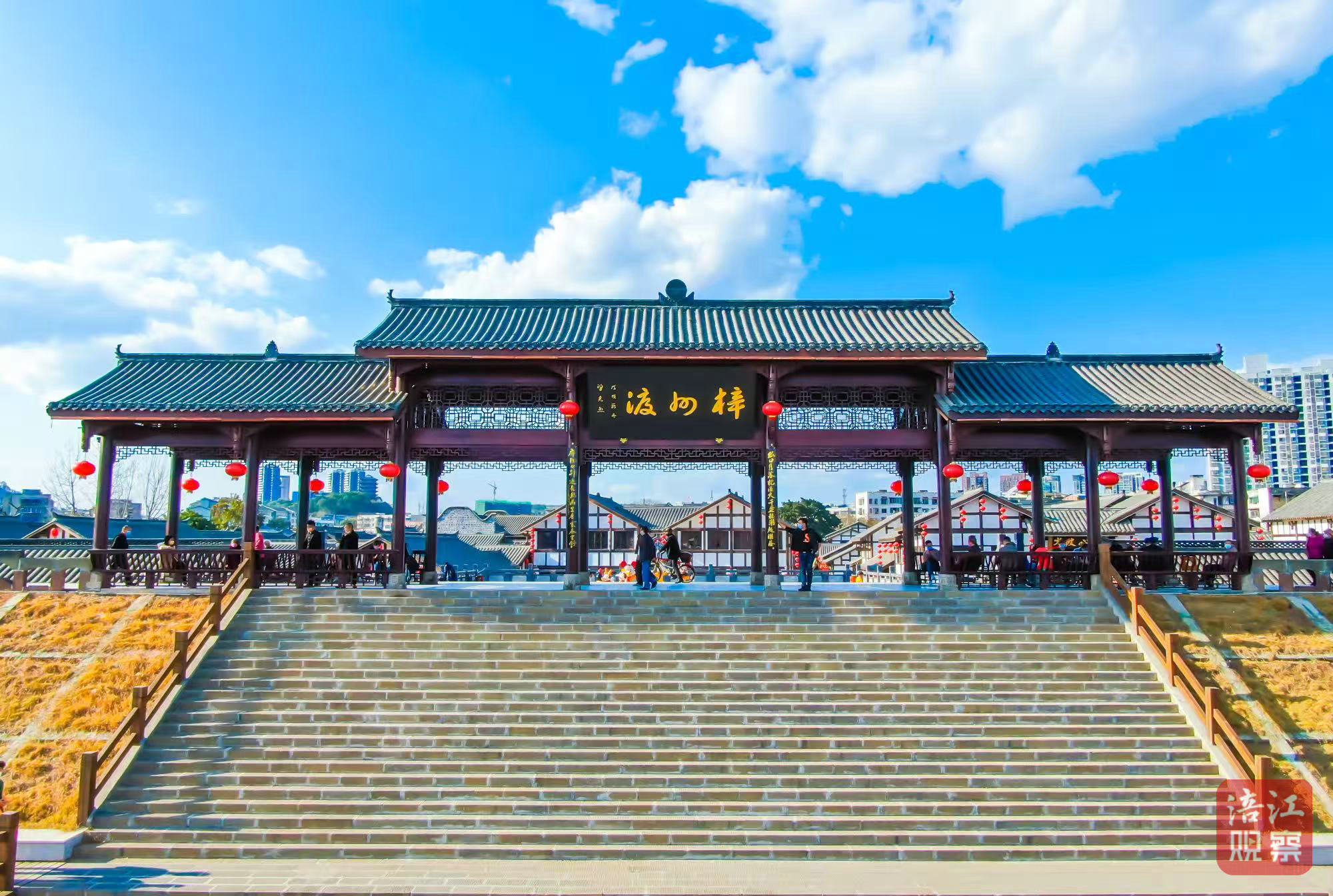 如今,步入這片文旅新區(qū),古老的石板路被細密拼接,懸掛大紅燈籠的雕梁畫棟映襯著青磚黛瓦。原南濟渡舊址矗立的梓州渡牌坊,如一位時間哲人,凝望涪江與凱江匯流東去,無聲講述著這片土地的榮光厚重與新生。