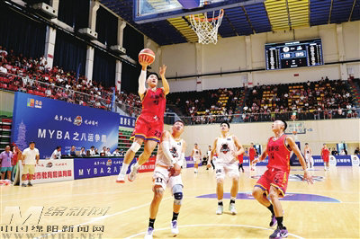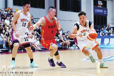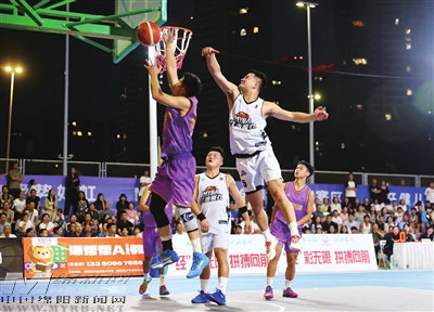 涪城鐵牛隊與高新先鋒隊精彩對決中,先鋒隊隊員帶球上籃。