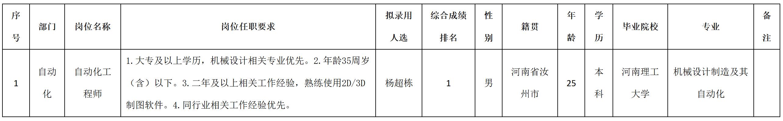 根據(jù)四川安和精密電子電器股份有限公司發(fā)布的招聘公告及招聘相關(guān)規(guī)定,經(jīng)筆試、面試、考察、體檢等程序,擬錄用楊超棟同志到四川安和精密電子電器股份有限公司工作,現(xiàn)予以公示,具體情況如下: