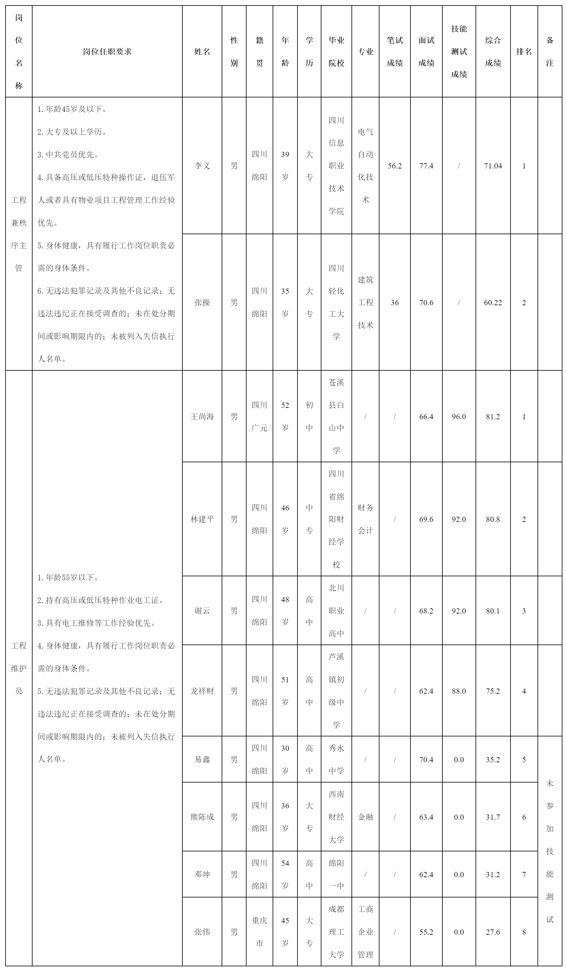 根據(jù)綿陽(yáng)科發(fā)商業(yè)服務(wù)有限公司(原綿陽(yáng)科發(fā)物業(yè)服務(wù)有限公司)發(fā)布的招聘公告及招聘相關(guān)規(guī)定,經(jīng)開(kāi)展筆試、面試等程序,現(xiàn)將測(cè)試成績(jī)予以公示。