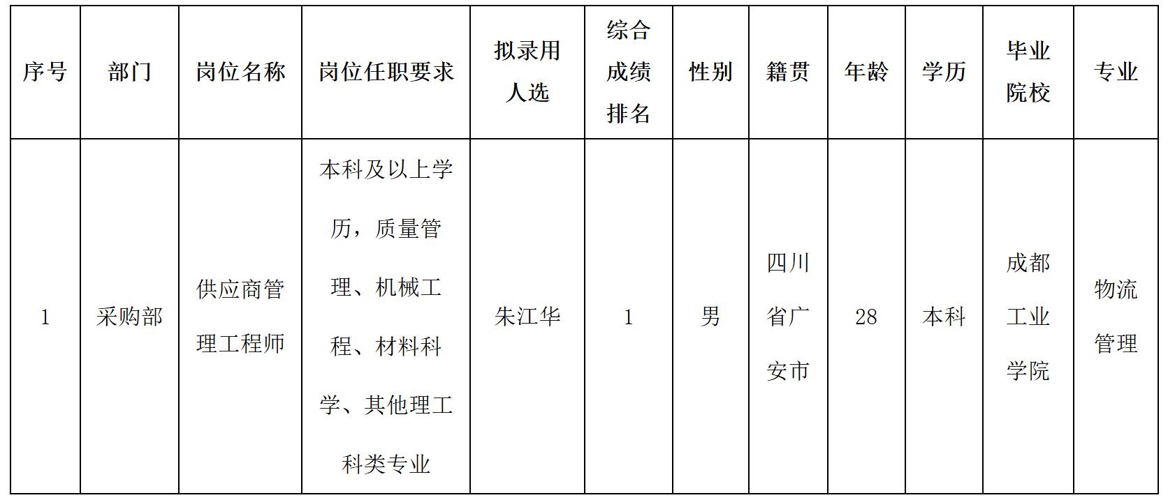 根據(jù)四川波鴻實(shí)業(yè)有限公司發(fā)布的招聘公告及招聘相關(guān)規(guī)定,經(jīng)面試、體檢等程序,擬錄用朱江華同志到四川威斯卡特工業(yè)有限公司綿陽(yáng)分公司工作,現(xiàn)予以公示,具體情況如下: