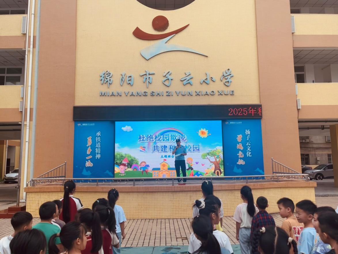 為了進(jìn)一步加強(qiáng)校園法治安全教育,增強(qiáng)學(xué)生自我保護(hù)意識(shí),營(yíng)造和諧健康的成長(zhǎng)環(huán)境。2025年9月2日,綿陽市子云小學(xué)特邀法治副校長(zhǎng)、工區(qū)派出所民警吳天偉警官到校,為全體師生開展了以防欺凌為主題的普法教育活動(dòng)。