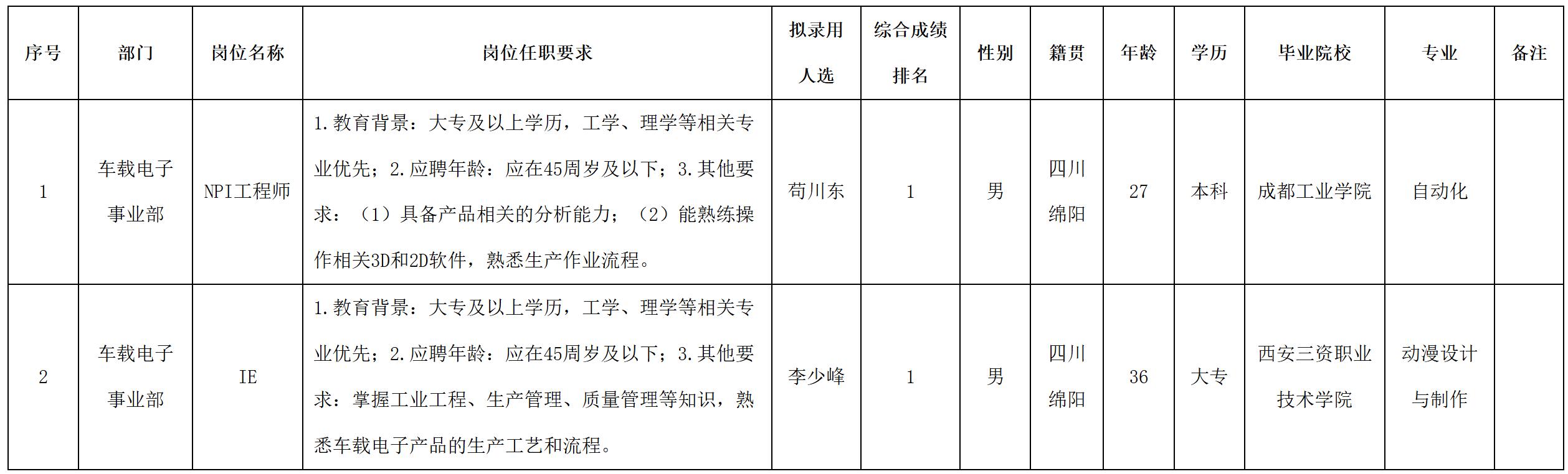 根據(jù)四川九州電子科技股份有限公司發(fā)布的招聘公告及招聘相關規(guī)定,經(jīng)筆試、面試、考察、體檢等程序,擬錄用茍川東等2名同志到四川九州電子科技股份有限公司工作,現(xiàn)予以公示,具體情況如下: