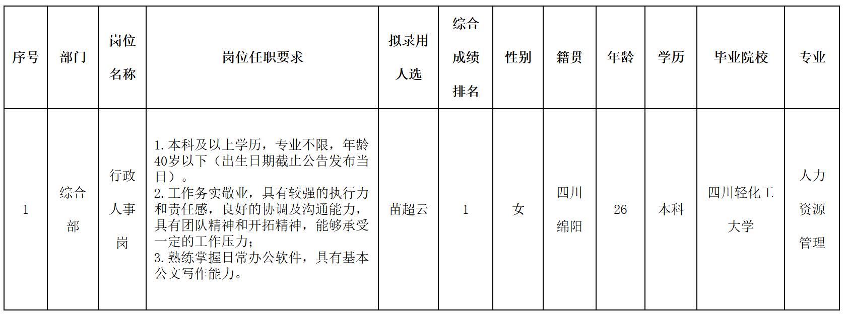 根據(jù)四川綿江能源有限公司發(fā)布的招聘公告及招聘相關(guān)規(guī)定,經(jīng)筆試、面試、考察、體檢等程序,擬錄用苗超云同志到四川綿江能源有限公司工作,現(xiàn)予以公示,具體情況如下: