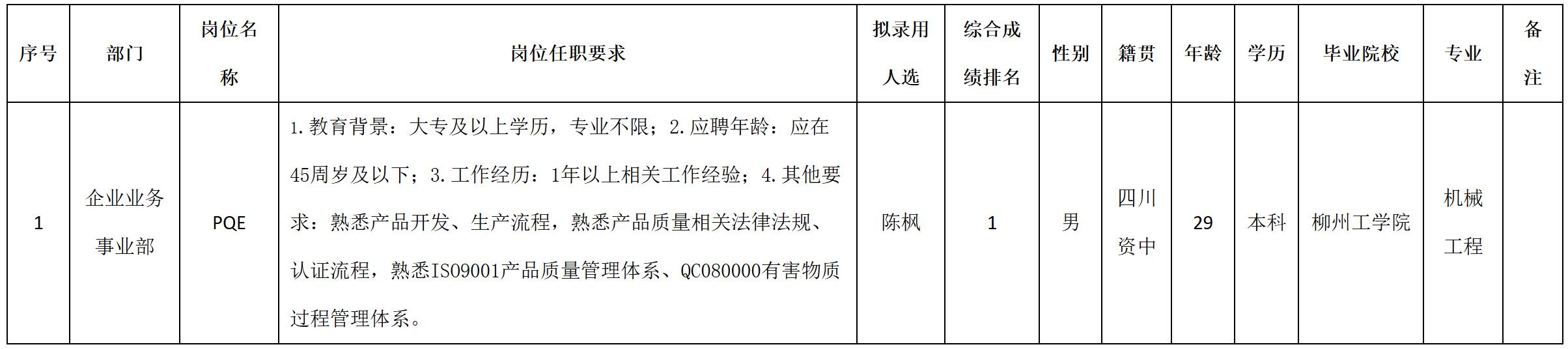 根據(jù)四川九州電子科技股份有限公司發(fā)布的招聘公告及招聘相關(guān)規(guī)定,經(jīng)筆試、面試、考察、體檢等程序,擬錄用陳楓同志到四川九州電子科技股份有限公司工作,現(xiàn)予以公示,具體情況如下: