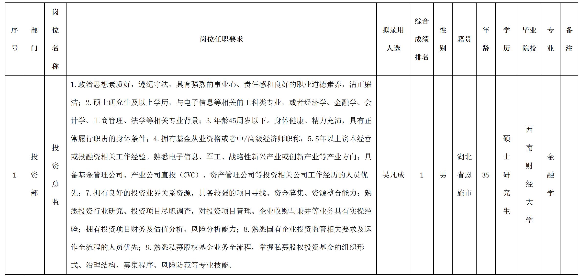 根據(jù)四川九洲君合私募基金管理有限公司發(fā)布的招聘公告及招聘相關(guān)規(guī)定,經(jīng)筆試、面試、考察、體檢等程序,擬錄用吳凡成同志到四川九洲君合私募基金管理有限公司工作,現(xiàn)予以公示,具體情況如下: