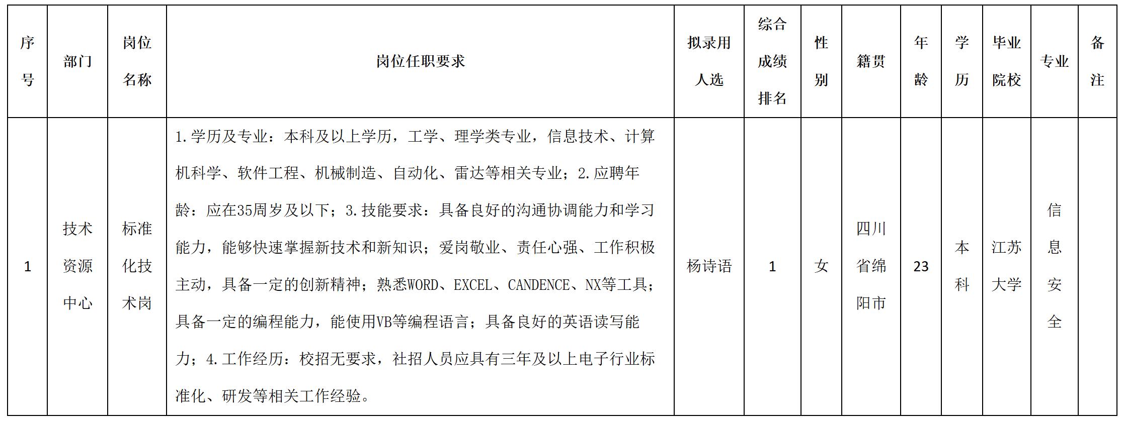 根據(jù)四川九洲空管科技有限責(zé)任公司發(fā)布的招聘公告及招聘相關(guān)規(guī)定,經(jīng)筆試、面試、考察、體檢等程序,擬錄用楊詩語同志到四川九洲空管科技有限責(zé)任公司工作,現(xiàn)予以公示,具體情況如下: