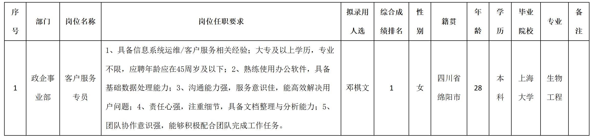 根據(jù)四川九洲投資控股集團(tuán)有限公司軟件與數(shù)據(jù)智能軍團(tuán)發(fā)布的招聘公告及招聘相關(guān)規(guī)定,經(jīng)筆試、面試、考察、體檢等程序,擬錄用鄧棋文同志到四川九洲投資控股集團(tuán)有限公司軟件與數(shù)據(jù)智能軍團(tuán)工作,現(xiàn)予以公示,具體情況如下: