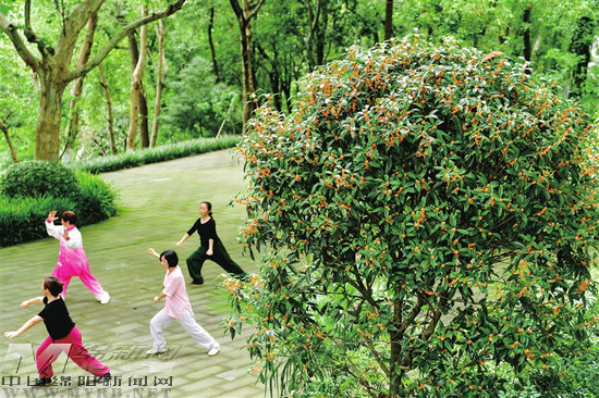 記者在南山公園入口、南山塔等處看見,郁郁蔥蔥的金桂樹上,金桂花開得正酣,一簇簇金燦燦的花朵綴滿翠綠枝頭。市民們或登山賞桂,或在桂花樹下起舞、健身,享受戶外休閑的樂趣。