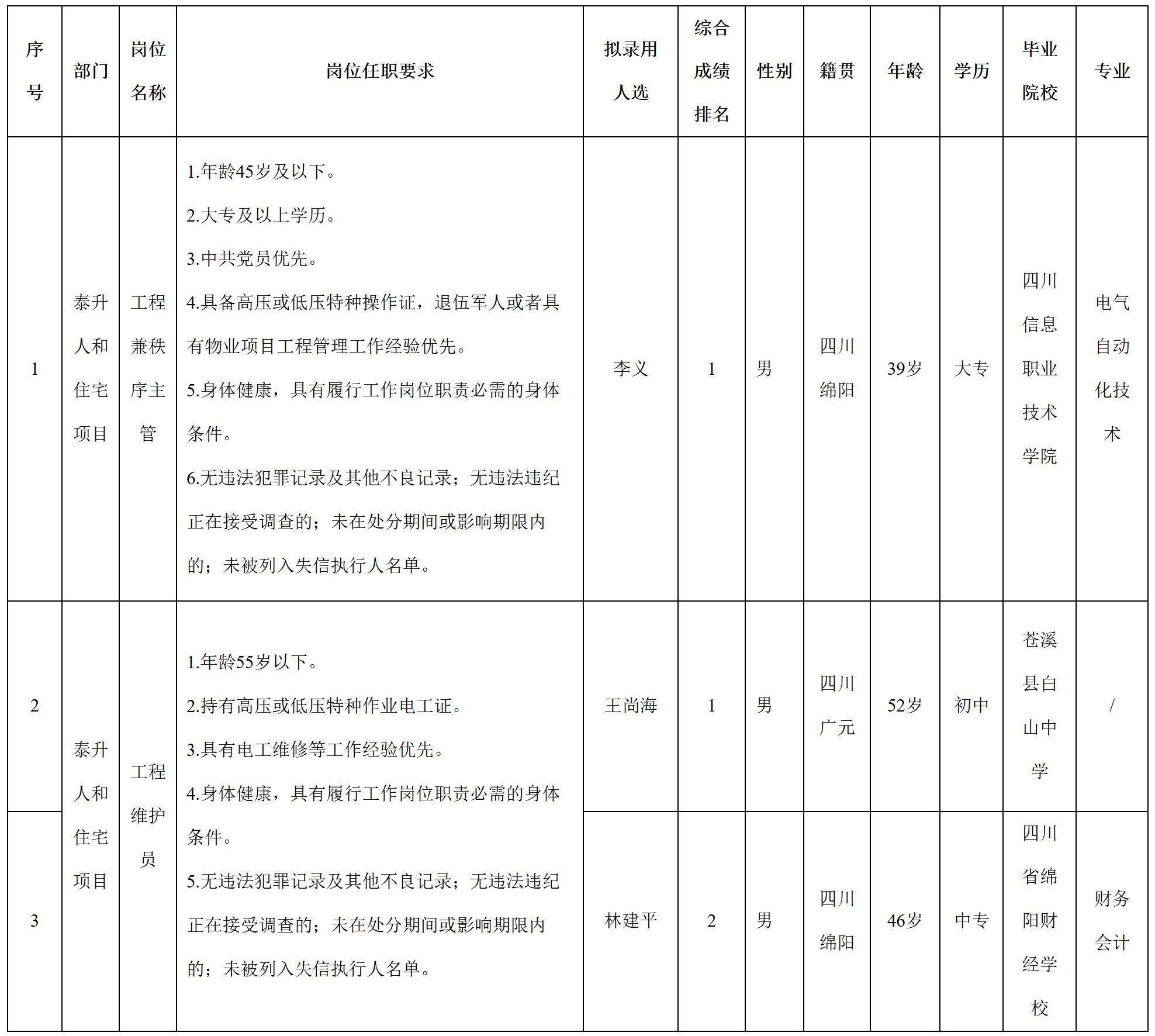 根據(jù)綿陽科發(fā)商業(yè)服務有限公司(原綿陽科發(fā)物業(yè)服務有限公司)發(fā)布的招聘公告及招聘相關規(guī)定,經筆試、面試、考察、體檢等程序,擬錄用李義等3名同志到泰升人和住宅項目工作,現(xiàn)予以公示,具體情況如下: