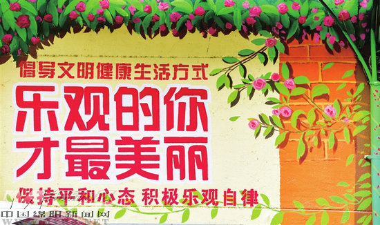 年輕志愿者關(guān)愛老人、大熊貓騎上紅色鯉魚……這些生動有趣的畫面不僅營造出溫馨和諧、活潑生動的社區(qū)氛圍,更在潛移默化中引導(dǎo)居民展現(xiàn)動人的風(fēng)采——“樂觀的你才最美麗”。