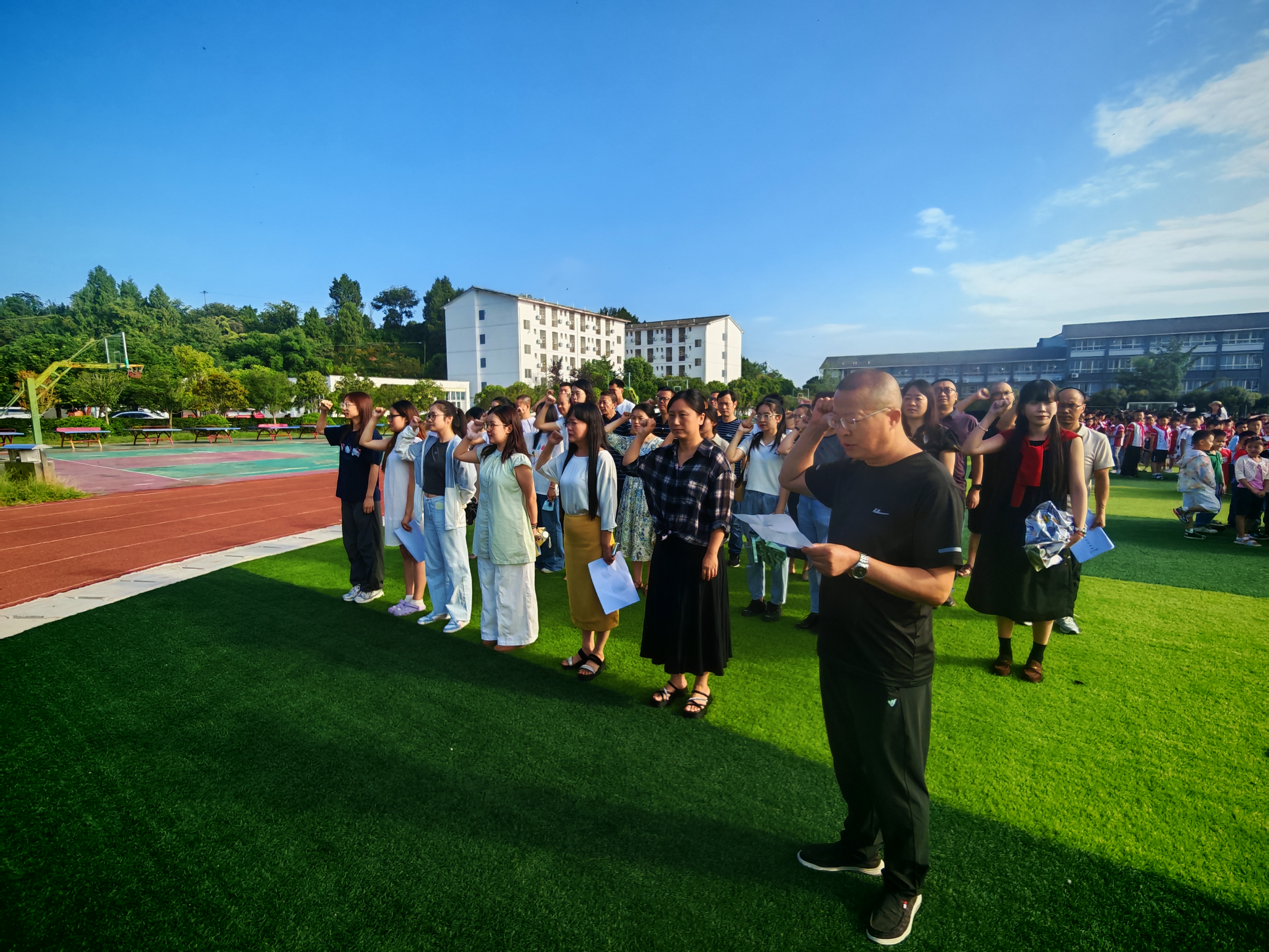 國旗徐徐升起,國歌聲聲嘹亮。開學(xué)典禮首先舉行了莊嚴(yán)的升旗儀式,同學(xué)們認(rèn)真舉手敬禮,眼神緊緊追著紅旗,懵懂中透著對國旗的敬畏,當(dāng)國歌的最后一個音符落下時,國旗恰好升到了旗桿頂端,在晨風(fēng)中獵獵作響,像一團(tuán)燃燒的火焰,映著藍(lán)天,也映著孩子們亮晶晶的眼睛,愛國主義教育在這一刻具象化、實(shí)效化。