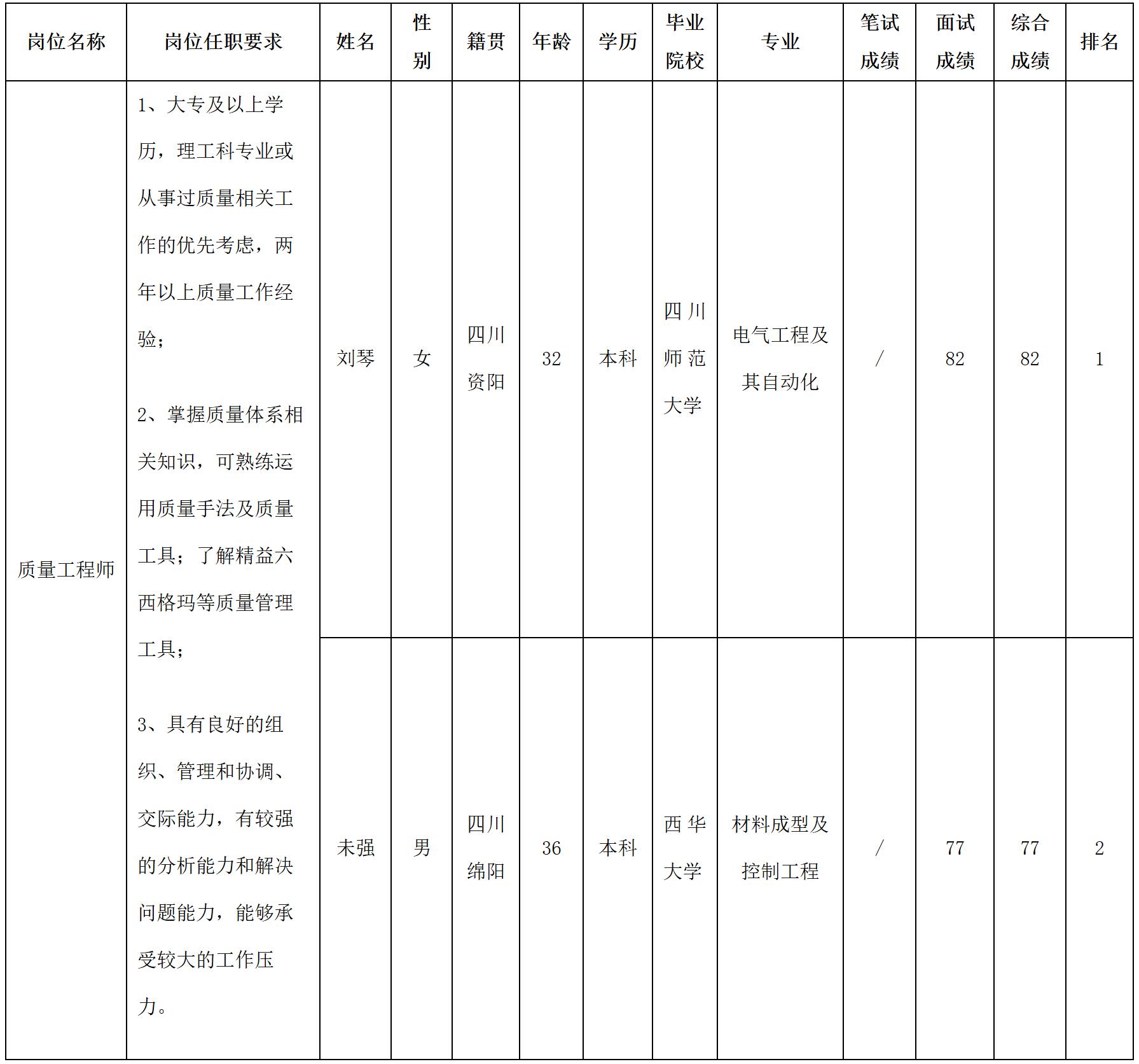 根據(jù)四川華豐科技股份有限公司發(fā)布的招聘公告及招聘相關(guān)規(guī)定,經(jīng)筆試、面試等程序,現(xiàn)將筆試(面試)成績(jī)予以公示。