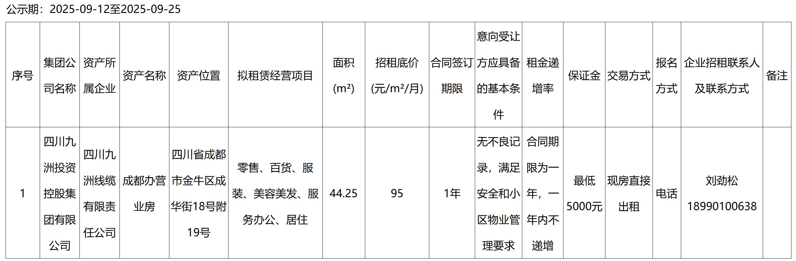 四川九洲線纜有限責任公司資產(chǎn)出租公告