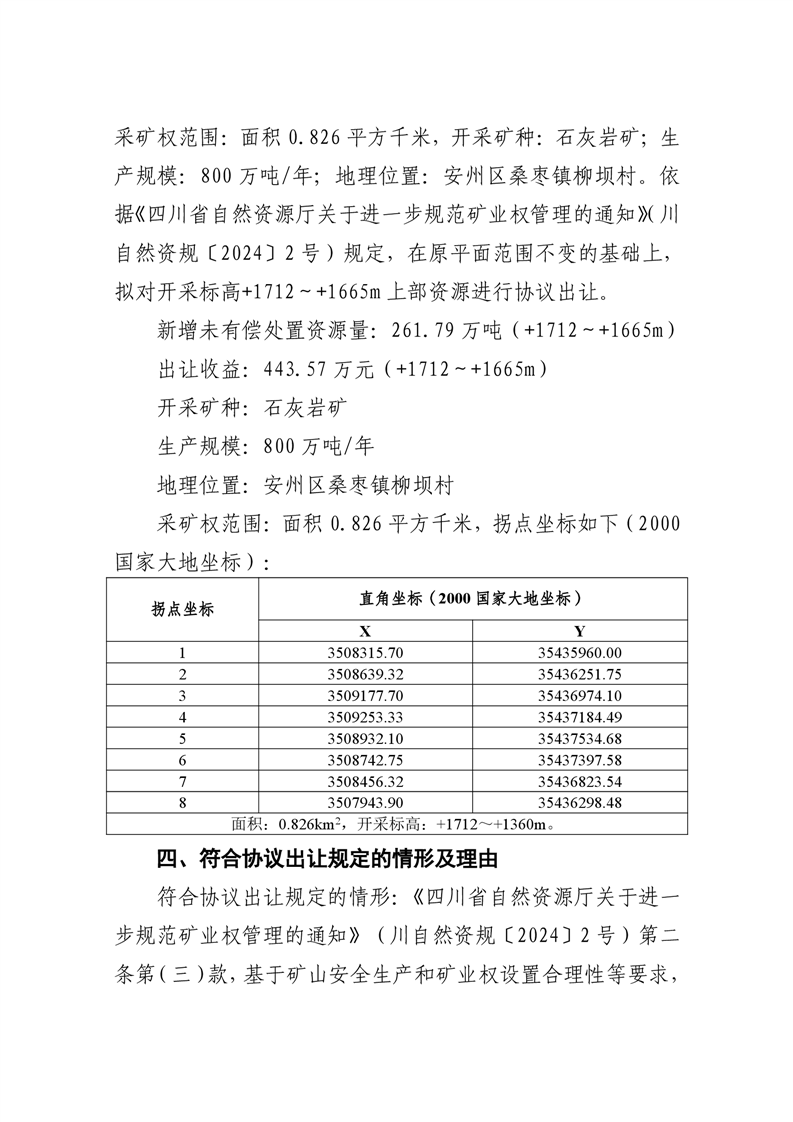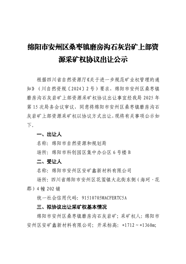 綿陽市安州區(qū)桑棗鎮(zhèn)磨房溝石灰?guī)r礦上部資源采礦權(quán)協(xié)議出讓公示
