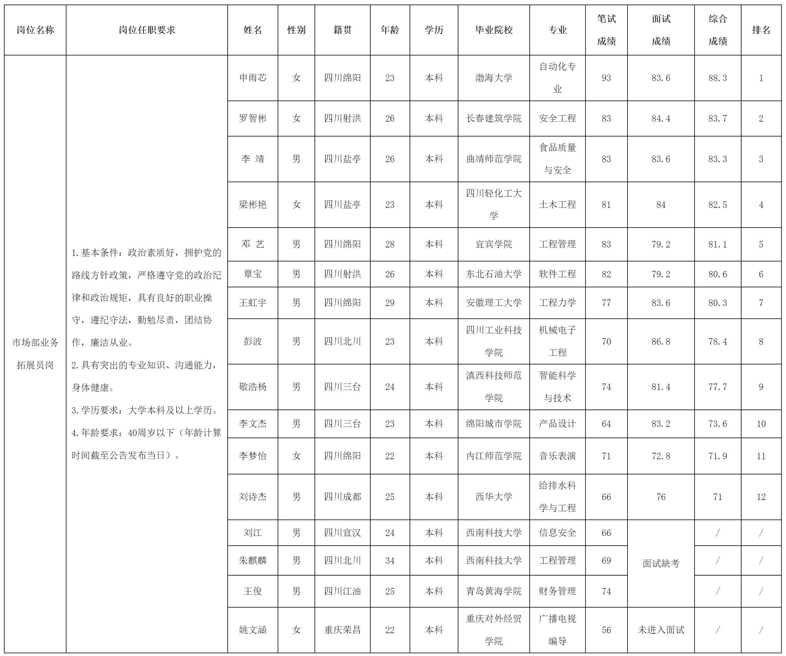 根據(jù)綿陽市建設(shè)工程質(zhì)量檢測(cè)中心有限責(zé)任公司發(fā)布的招聘公告及招聘相關(guān)規(guī)定,現(xiàn)將筆試(面試)成績予以公示。