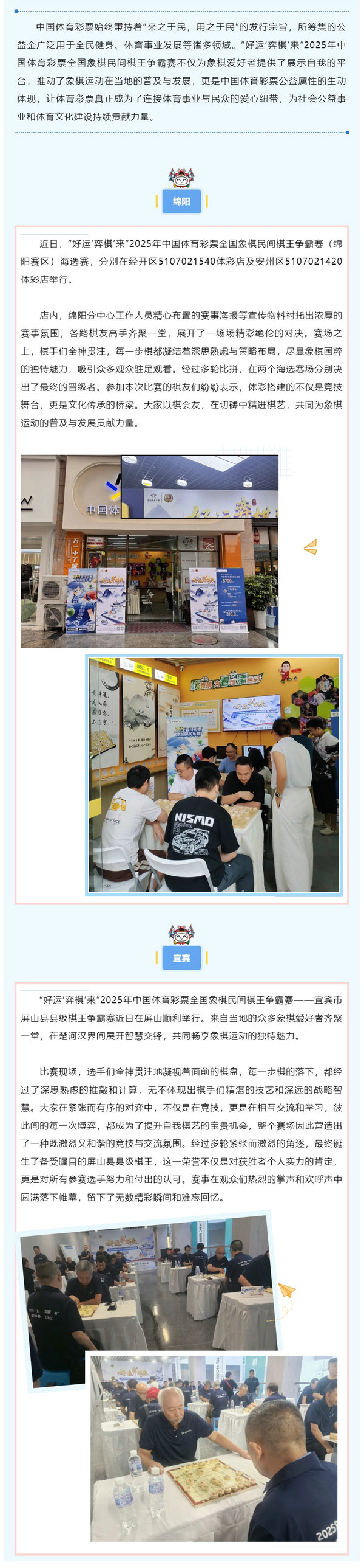 近日,“好運(yùn)‘弈棋’來”2025年中國體育彩票全國象棋民間棋王爭(zhēng)霸賽(綿陽賽區(qū))海選賽,分別在經(jīng)開區(qū)5107021540體彩店及安州區(qū)5107021420體彩店舉行。