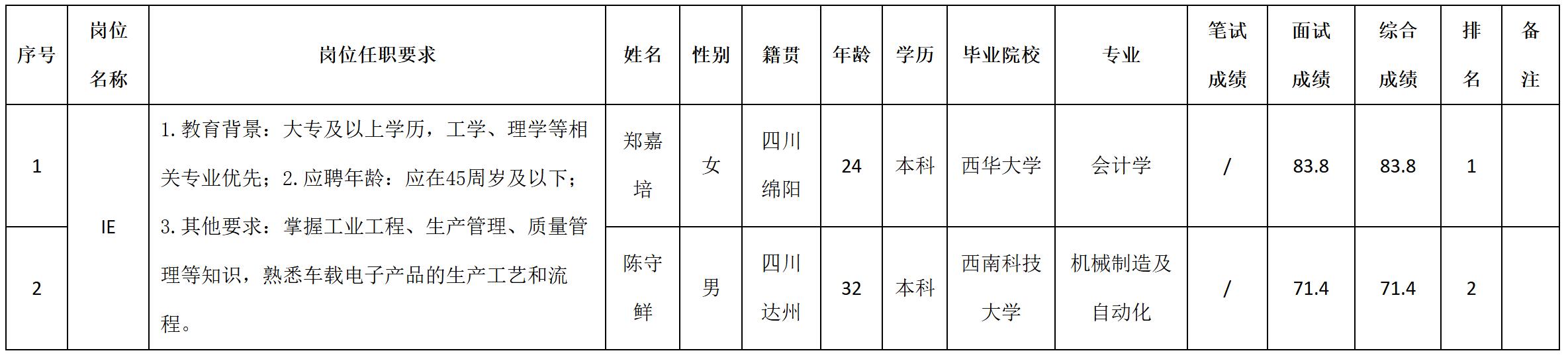 根據(jù)四川九州電子科技股份有限公司發(fā)布的招聘公告及招聘相關(guān)規(guī)定,經(jīng)筆試、面試等程序,現(xiàn)將筆試(面試)成績予以公示。