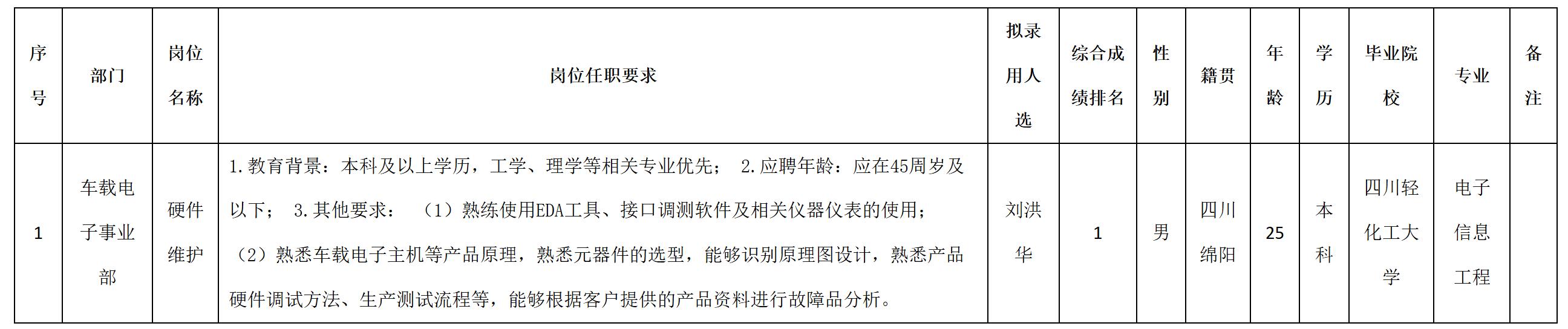 根據(jù)四川九州電子科技股份有限公司發(fā)布的招聘公告及招聘相關(guān)規(guī)定,經(jīng)筆試、面試、考察、體檢等程序,擬錄用劉洪華同志到四川九州電子科技股份有限公司工作,現(xiàn)予以公示,具體情況如下: