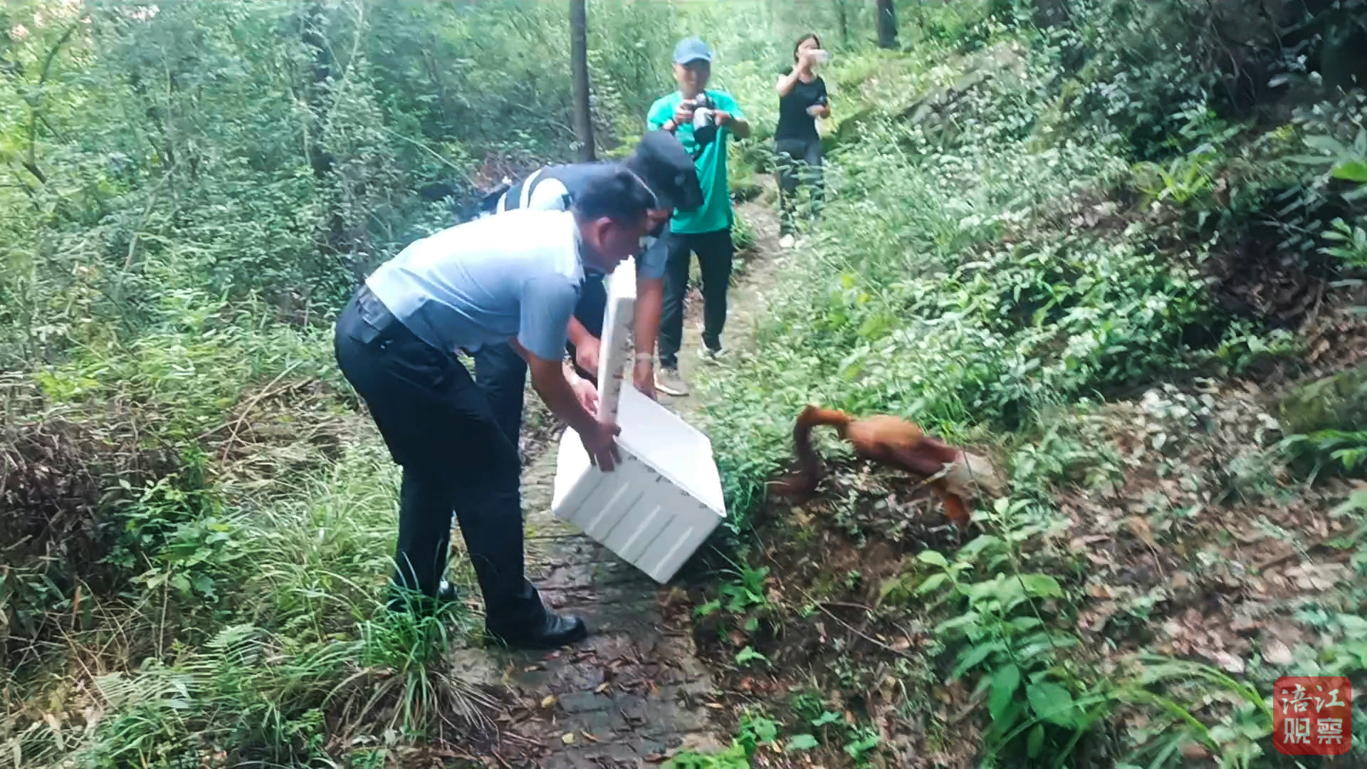 下午4時(shí)許,民警攜帶這只紅白鼯鼠來到含增鎮(zhèn)郊外山林放生,讓它盡快與同伴團(tuán)聚。當(dāng)泡沫箱蓋子一揭開,小家伙像離弦之箭迅速竄出去,一轉(zhuǎn)眼就在密林里消失得無影無蹤。