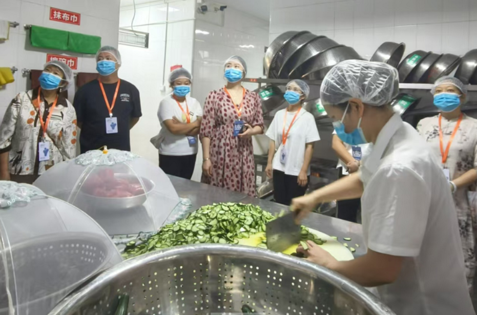 然后,實地參觀。查看食堂信息公示欄和互聯(lián)網(wǎng)+“明廚亮灶”工程、食堂智能化管理系統(tǒng);參觀庫房、廚房設(shè)施設(shè)備、環(huán)境衛(wèi)生、餐具消毒等方面的工作實施情況。