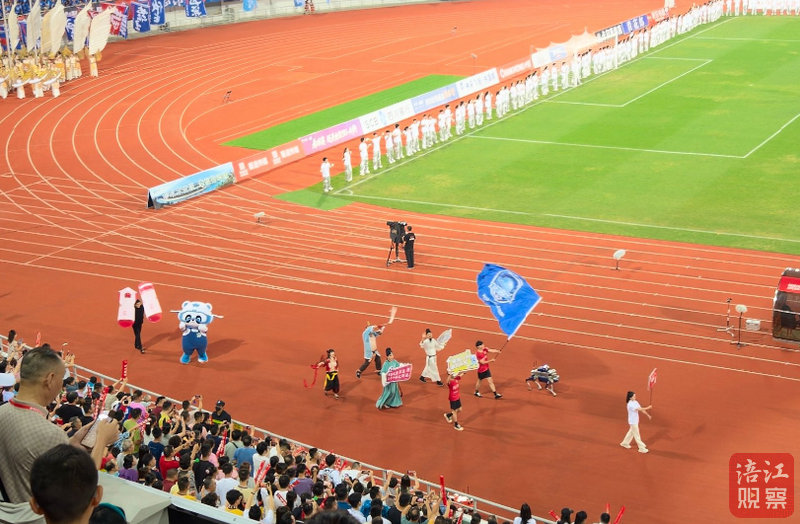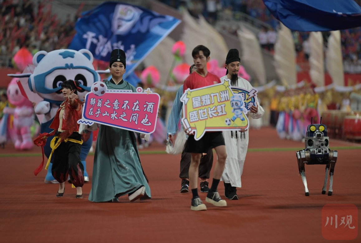 入場完畢后,綿陽特色方隊(duì)再次呼喊“星耀九洲 盛世長虹”口號(hào),并配合各自角色的標(biāo)志性動(dòng)作定格。這一刻,整個(gè)球場仿佛被點(diǎn)燃了一般,氣氛熱烈到了極點(diǎn)。