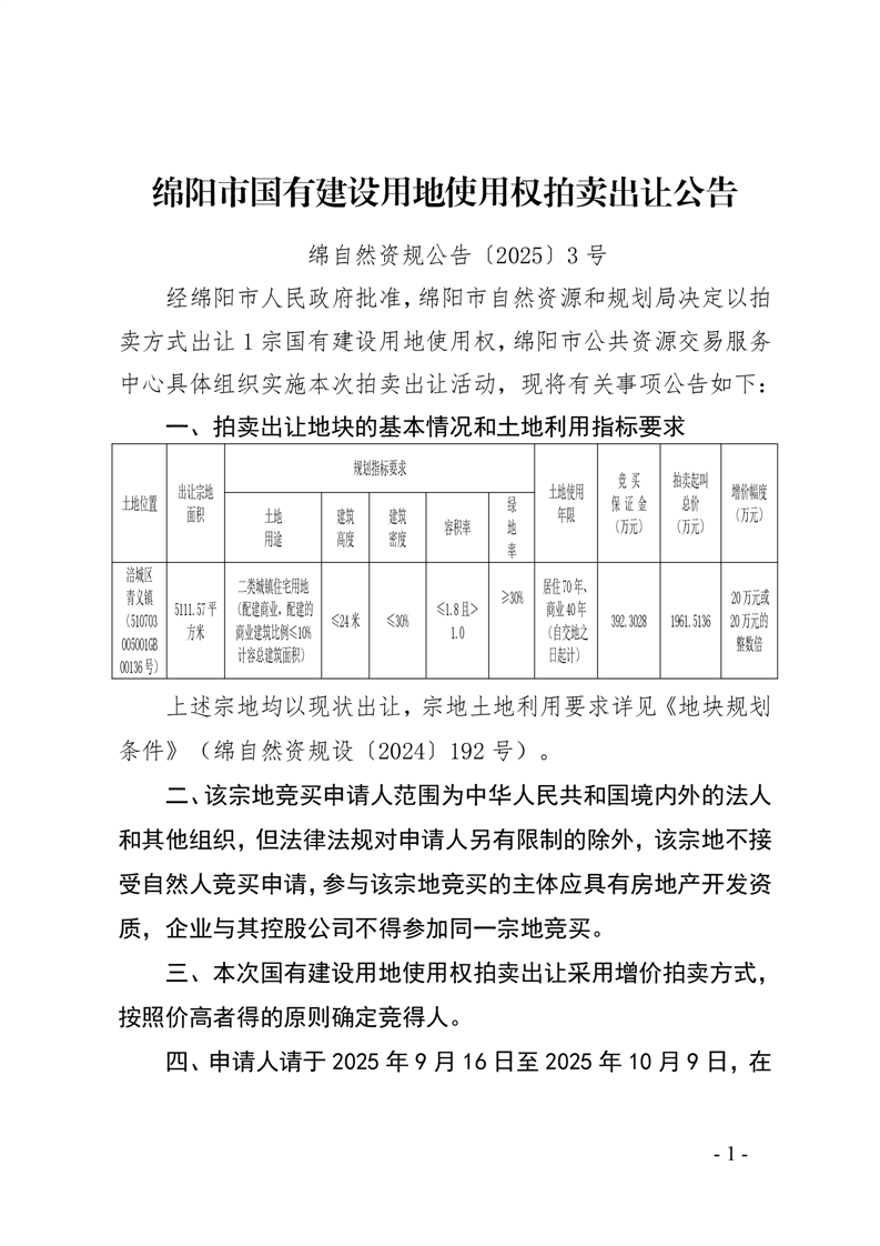 綿陽(yáng)市國(guó)有建設(shè)用地使用權(quán)拍賣出讓公告(綿自然資規(guī)公告〔2025〕3號(hào))