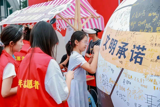 在“文明銀行·熱力兌換站”,文明闖關(guān)成功的市民們有序排隊,領(lǐng)取由愛心商家提供的“文明觀賽”好禮。在文明熱梗“造”起來互動打卡區(qū),大家用創(chuàng)意和熱情傳遞文明觀賽正能量。在“文明球迷,有球必應(yīng)”簽名球打卡區(qū),眾多市民駐足簽名合影。
