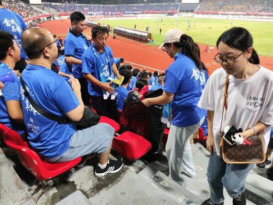 在散場時,觀眾席上的球迷并未匆忙離場或出現(xiàn)混亂。大家不約而同地收拾好座位旁的垃圾,在帶走隨身物品的同時,自覺將廢棄物一并帶走,有序退場。