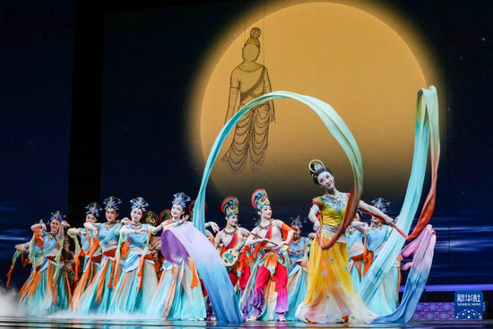 9月20日晚,演員在敦煌大劇院表演新版《絲路花雨》。