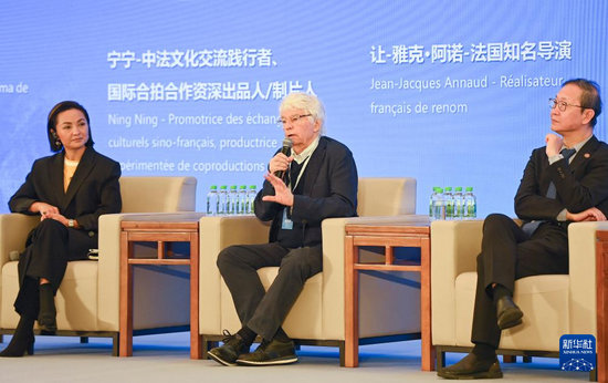 9月24日,法國(guó)導(dǎo)演讓-雅克·阿諾(中)在“中法影像對(duì)話沙龍”交流。