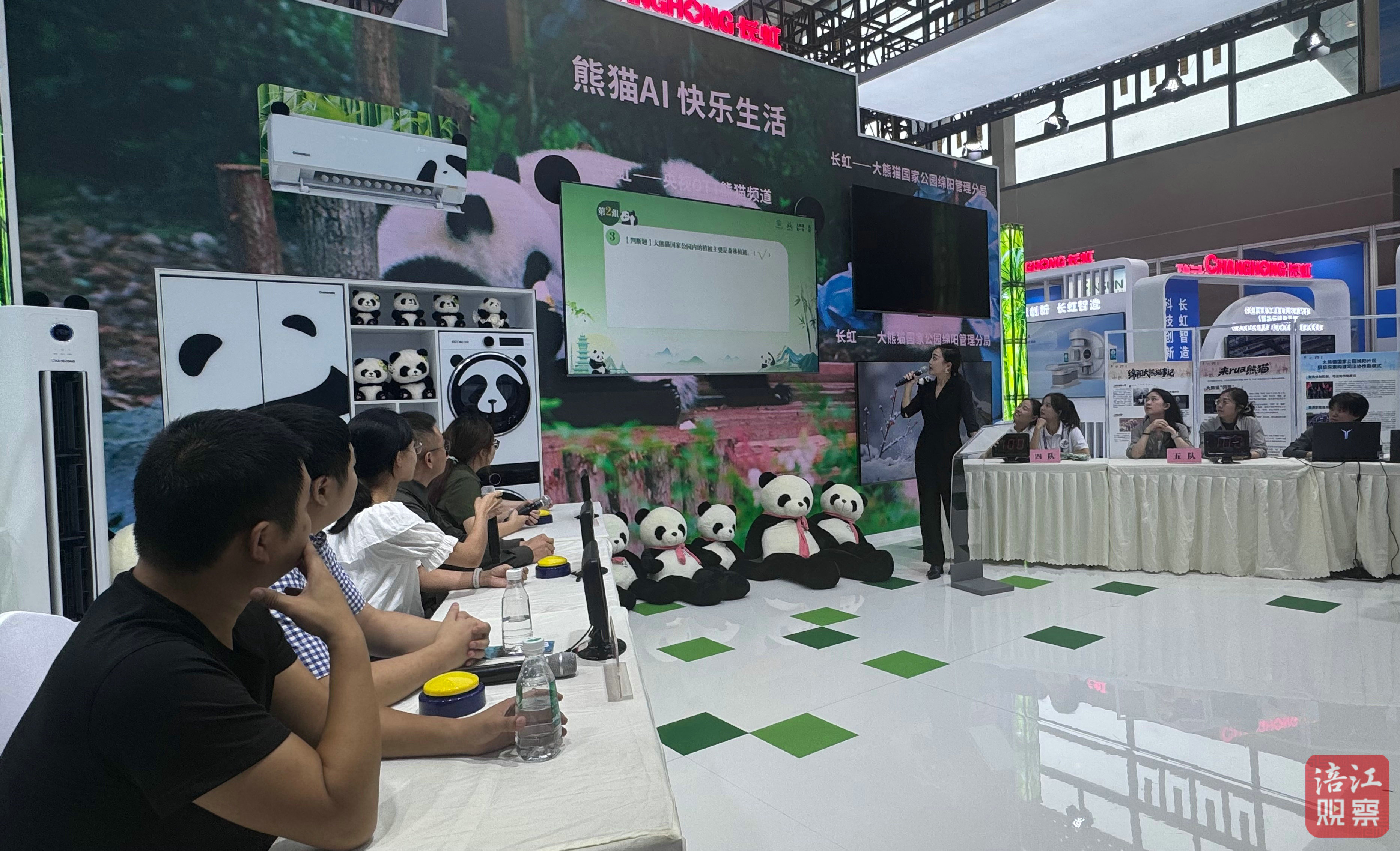 這場名為“守護(hù)熊貓家園 共建生態(tài)綿陽”的科普知識競賽,巧妙融合了線下競賽、主題展覽和游戲互動。走進(jìn)現(xiàn)場,兩大展區(qū)格外引人注目——大熊貓國家公園綿陽片區(qū)展區(qū)和野生動物保護(hù)知識展區(qū),而最具人氣的當(dāng)屬知識搶答環(huán)節(jié)。“數(shù)字熊貓”主題展臺科技感十足,以數(shù)字技術(shù)勾勒出綿陽作為“大熊貓第一市”的生態(tài)畫卷——
