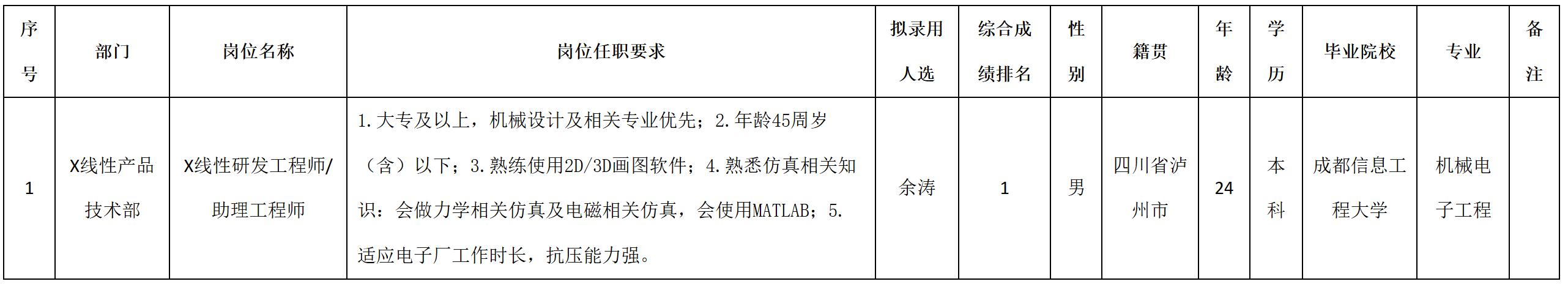 根據(jù)四川安和精密電子電器股份有限公司發(fā)布的招聘公告及招聘相關(guān)規(guī)定,經(jīng)筆試、面試、考察、體檢等程序,擬錄用余濤同志到四川安和精密電子電器股份有限公司工作,現(xiàn)予以公示,具體情況如下:
