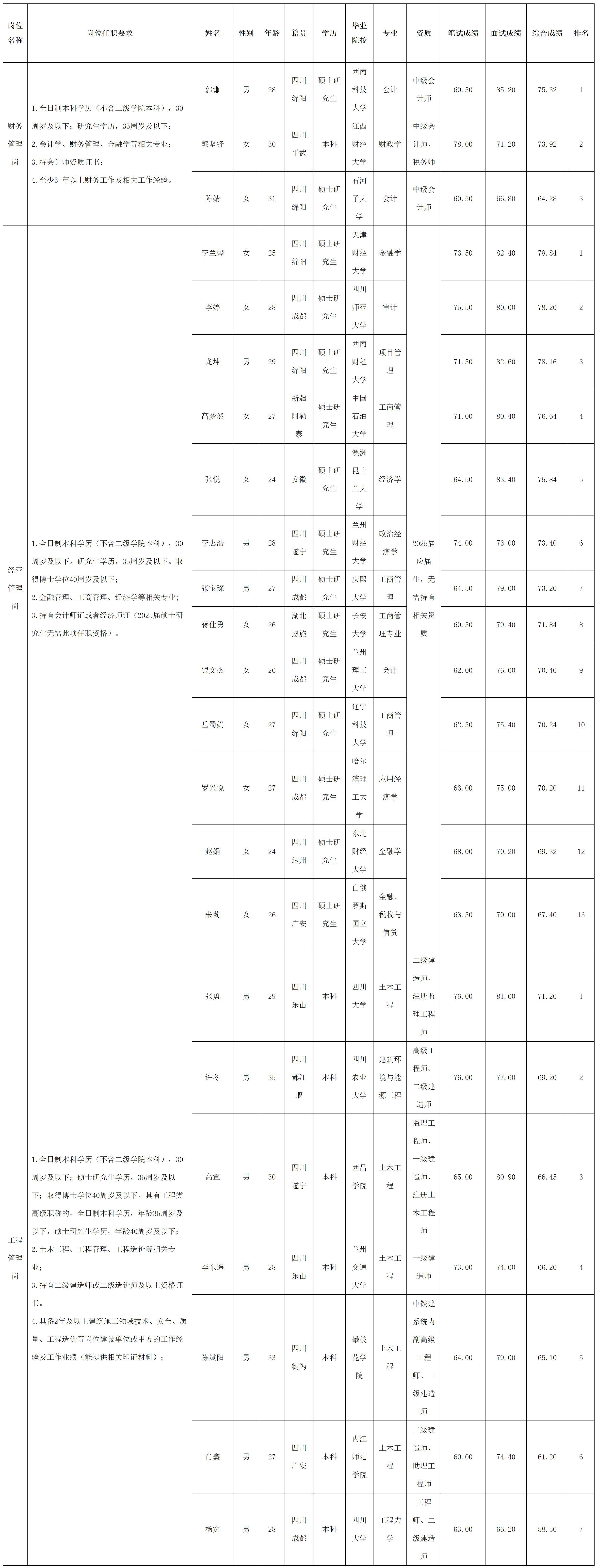 根據(jù)綿陽機場(集團)有限公司2025年8月發(fā)布的《關(guān)于2025年秋季招聘財務(wù)管理等崗位的公告》以及招聘相關(guān)規(guī)定,現(xiàn)將財務(wù)管理崗、經(jīng)營管理崗、工程管理崗筆試、面試、綜合成績按照排名予以公示。