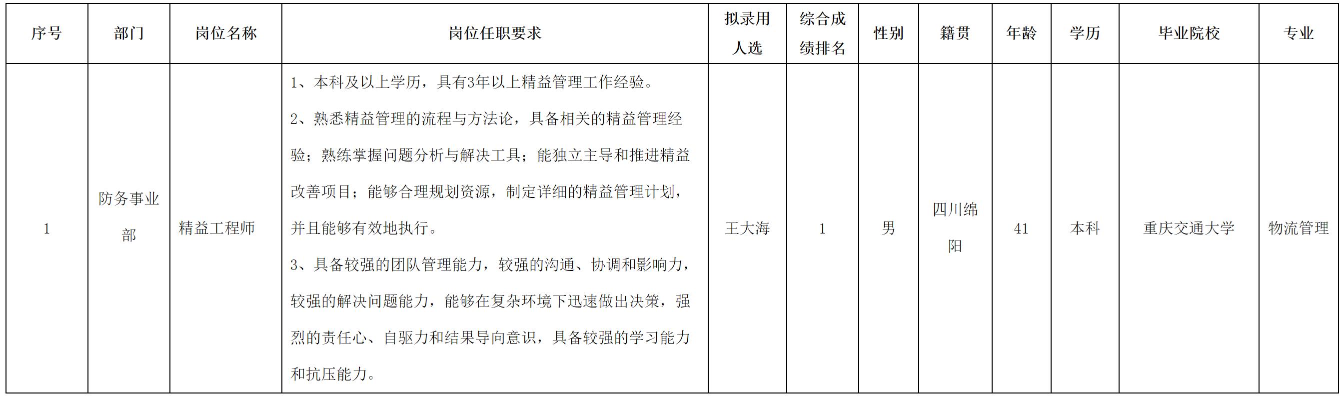 根據(jù)四川華豐科技股份有限公司發(fā)布的招聘公告及招聘相關(guān)規(guī)定,經(jīng)面試、考察、體檢等程序,擬錄用王大海同志到四川華豐科技股份有限公司工作,現(xiàn)予以公示,具體情況如下: