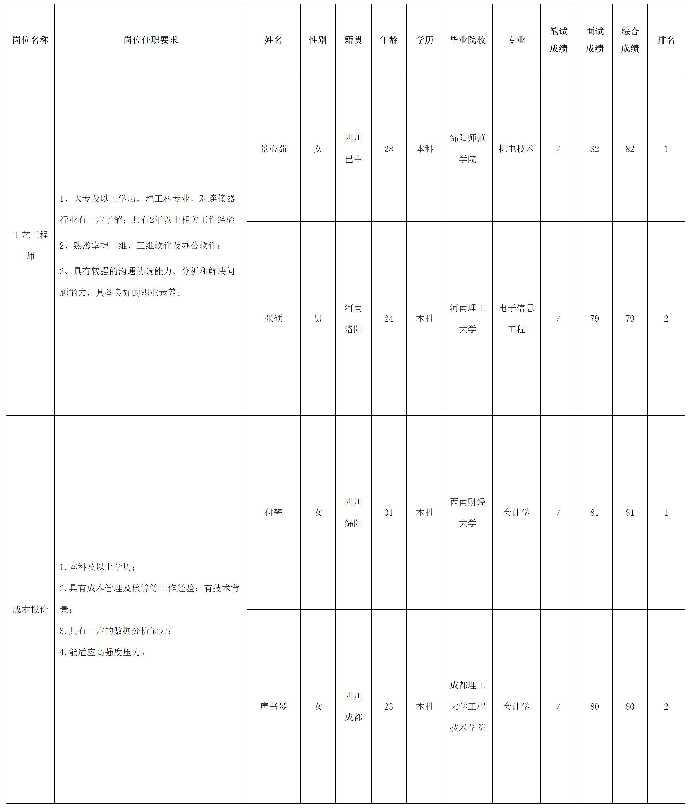 根據(jù)四川華豐科技股份有限公司發(fā)布的招聘公告及招聘相關規(guī)定,經(jīng)面試等程序,現(xiàn)將面試成績予以公示。