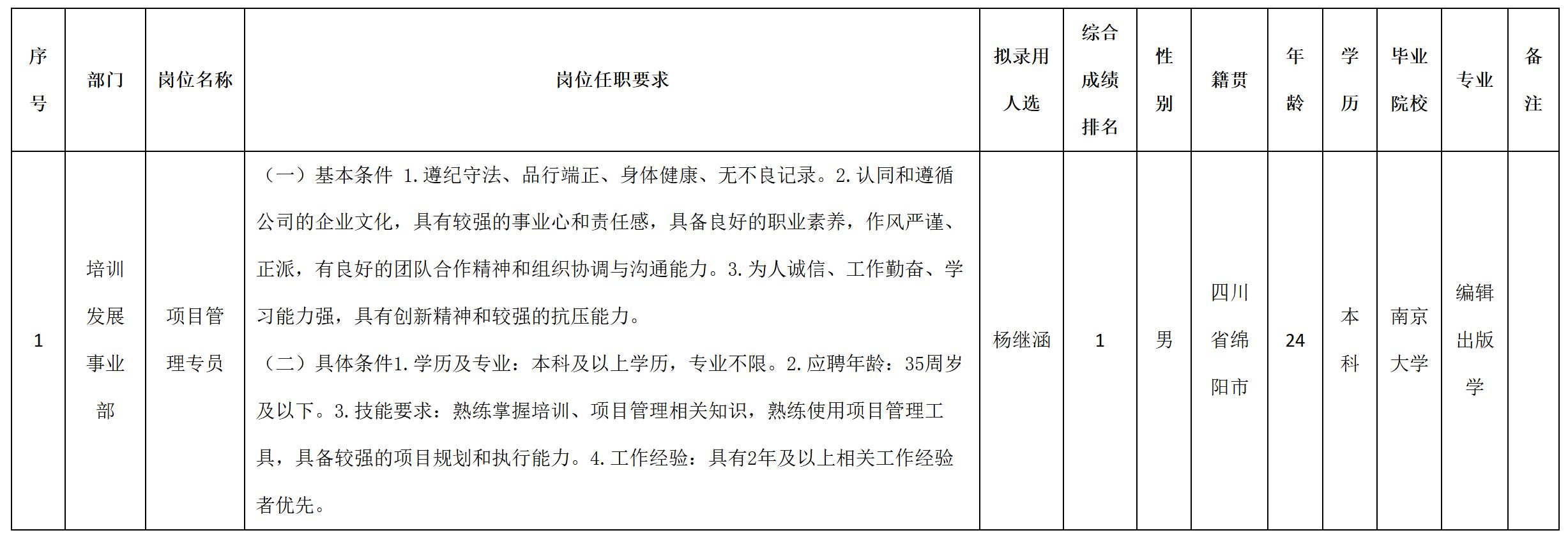 根據(jù)四川九洲教育投資管理有限公司發(fā)布的招聘公告及招聘相關(guān)規(guī)定,經(jīng)測(cè)試、考察、體檢等程序,擬錄用楊繼涵同志到四川九洲教育投資管理有限公司工作,現(xiàn)予以公示,具體情況如下: