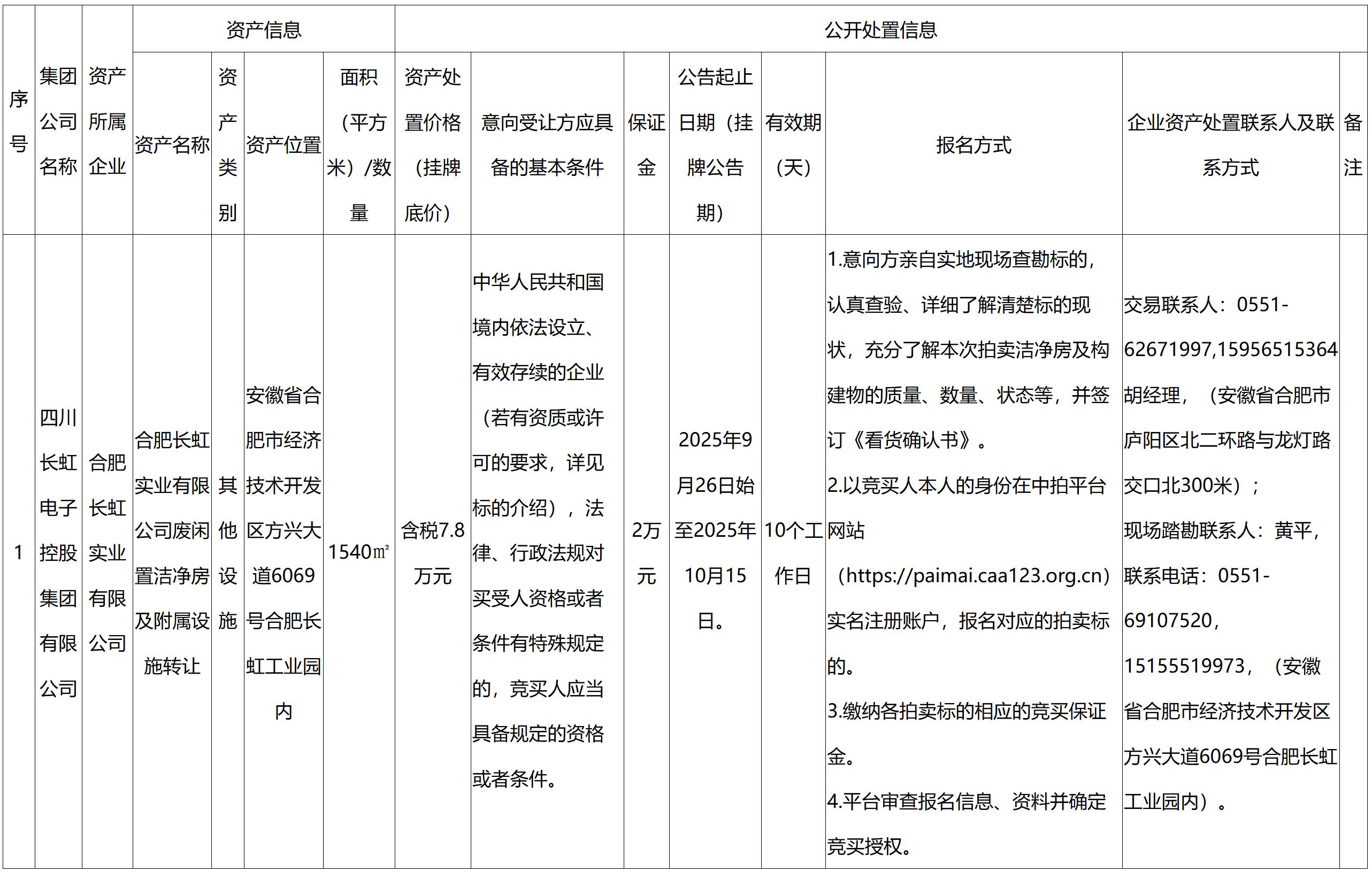 合肥長(zhǎng)虹實(shí)業(yè)有限公司閑置資產(chǎn)處置公告