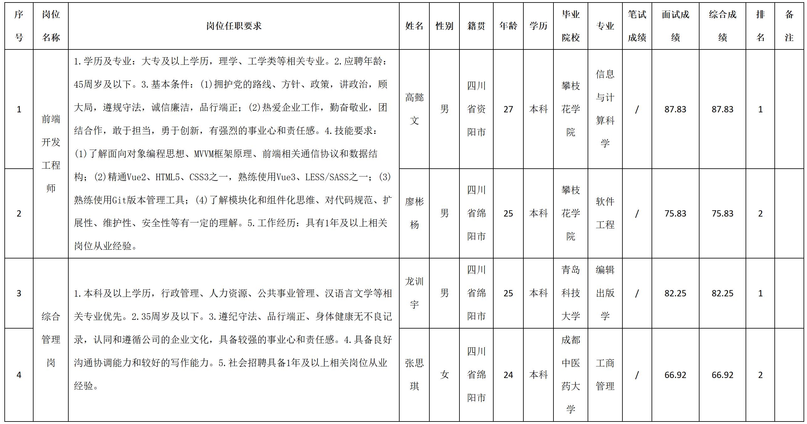 根據(jù)四川九強(qiáng)通信科技有限公司發(fā)布的招聘公告及招聘相關(guān)規(guī)定,現(xiàn)將測(cè)試成績(jī)予以公示。