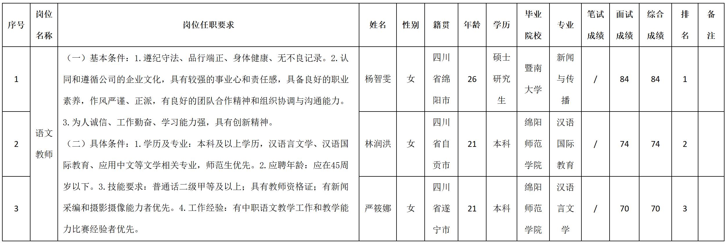 根據(jù)四川九洲教育投資管理有限公司發(fā)布的招聘公告及招聘相關(guān)規(guī)定,現(xiàn)將測(cè)試成績(jī)予以公示。