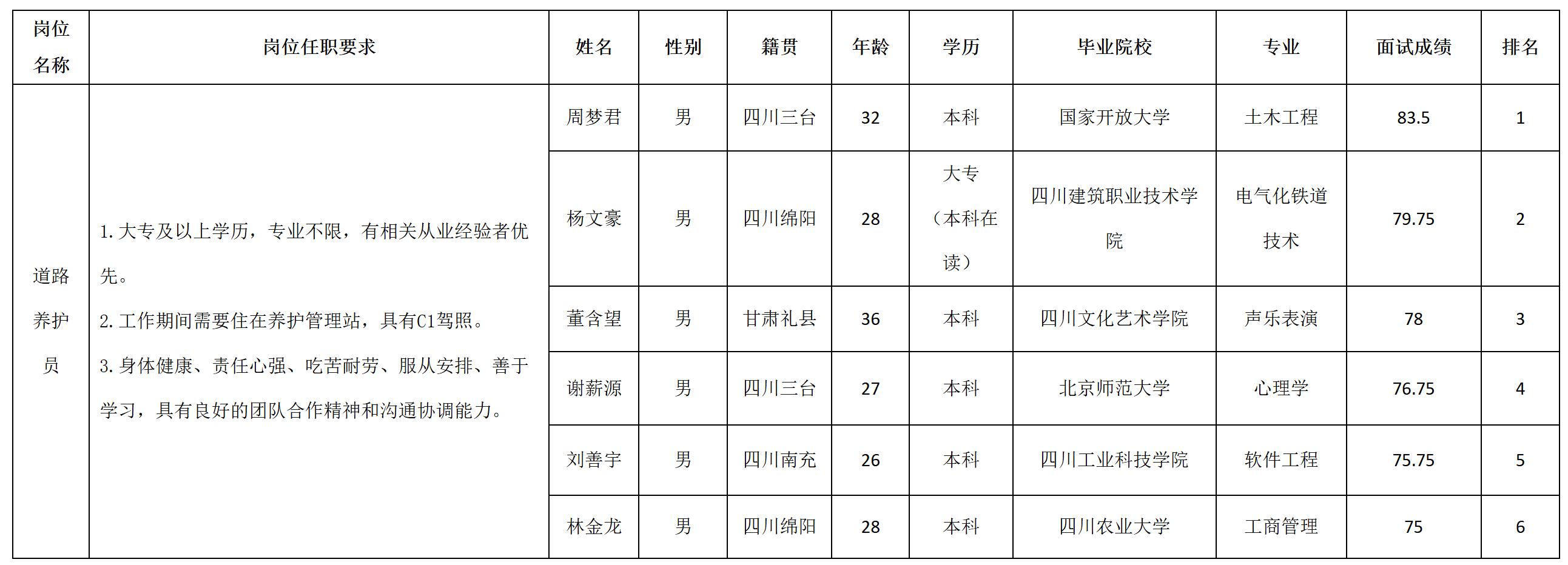 根據(jù)2025年退役軍人就業(yè)服務(wù)專項(xiàng)行動(dòng)——“戎耀歸蜀”綿陽(yáng)退役軍人及軍屬招聘活動(dòng)及綿陽(yáng)路橋建設(shè)集團(tuán)有限責(zé)任公司招聘相關(guān)規(guī)定,經(jīng)面試程序,現(xiàn)將面試成績(jī)予以公示。