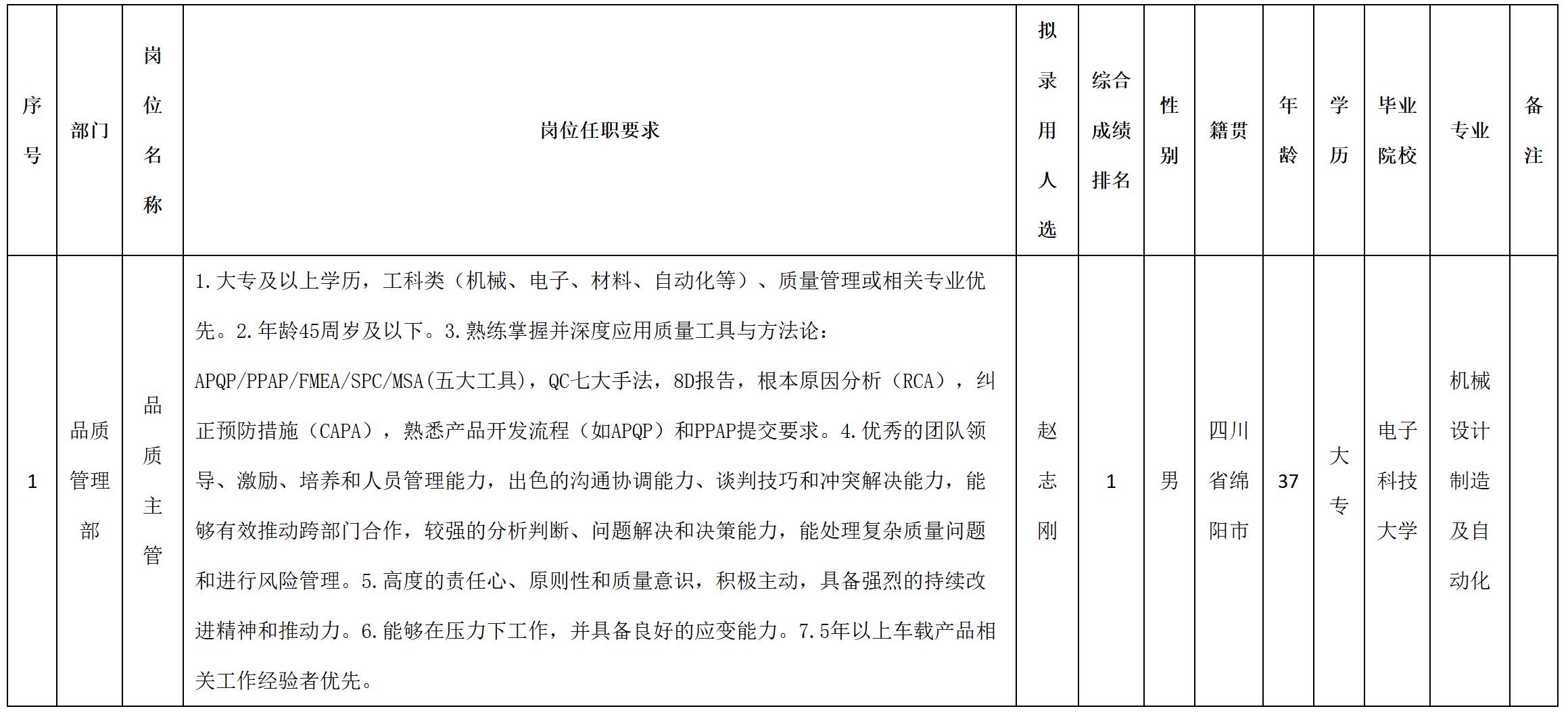 根據(jù)四川安和精密電子電器股份有限公司發(fā)布的招聘公告及招聘相關(guān)規(guī)定,經(jīng)測試、考察、體檢等程序,擬錄用趙志剛同志到四川安和精密電子電器股份有限公司工作,現(xiàn)予以公示,具體情況如下: