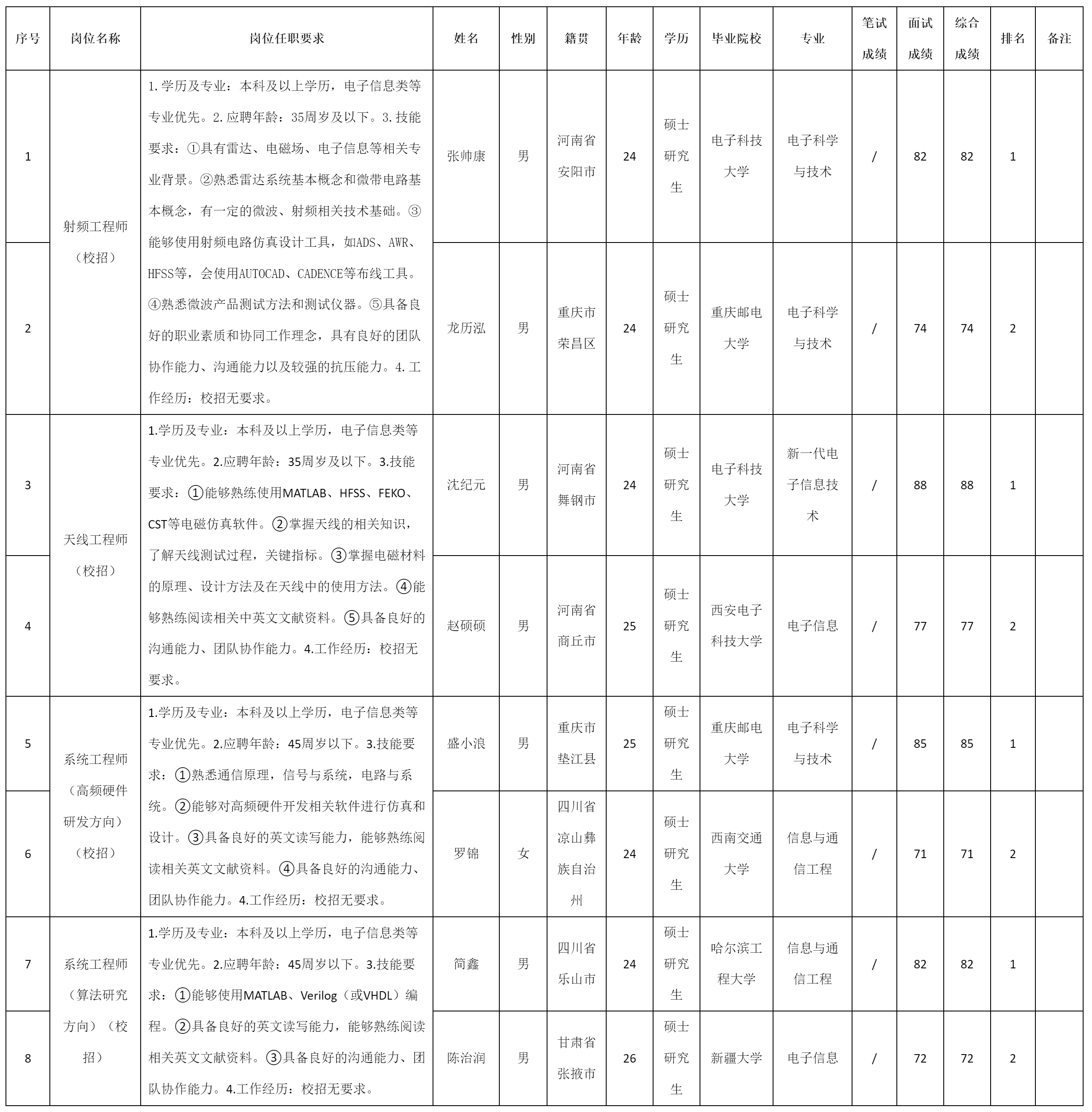 根據(jù)四川九洲電器集團有限責任公司發(fā)布的招聘公告及招聘相關(guān)規(guī)定,現(xiàn)將測試成績予以公示。